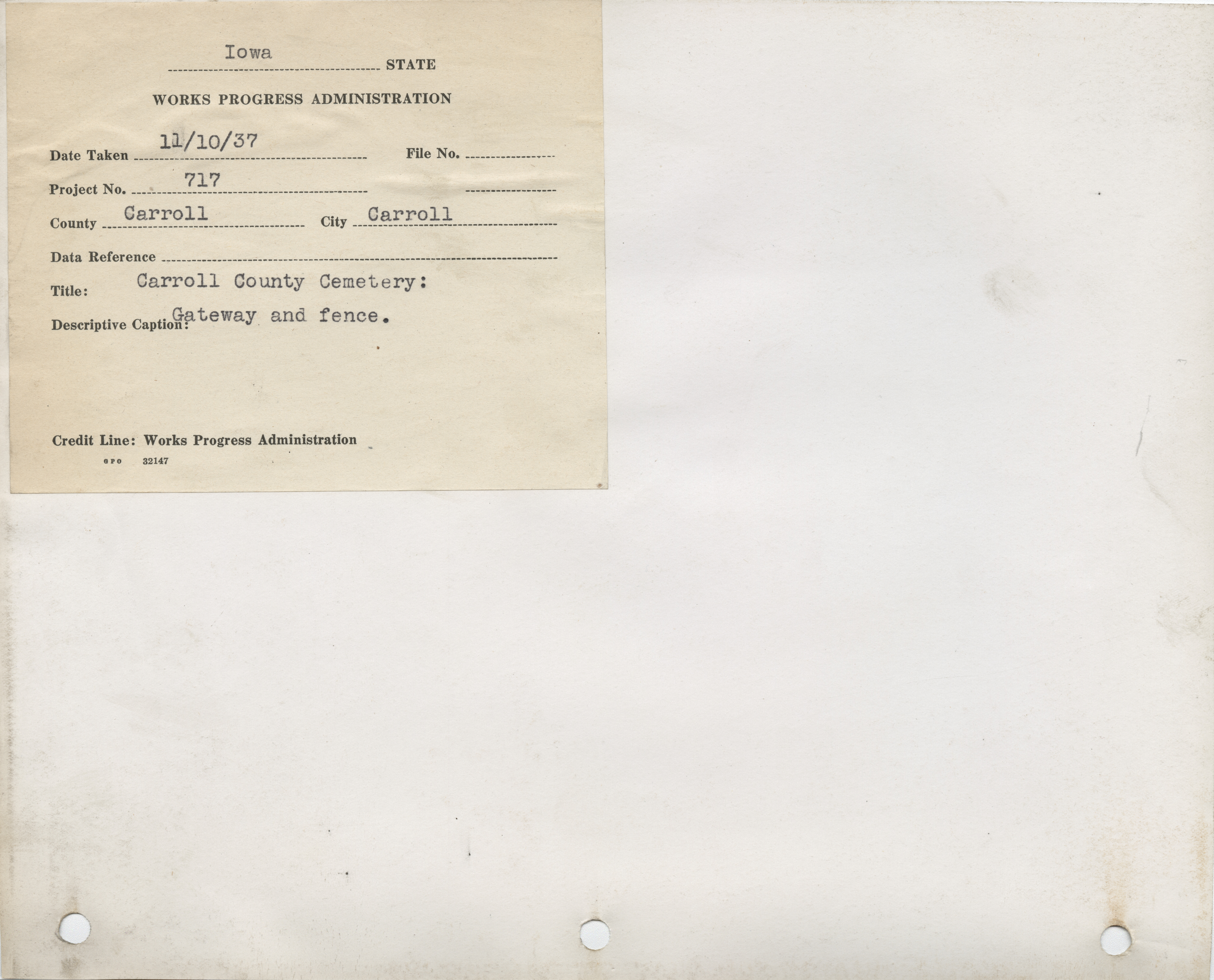 - "Photograph of gateway and fence in the Carroll County Cemetery", Work Projects Administration (Iowa) Photographs, Iowa State University Library Digital Collections