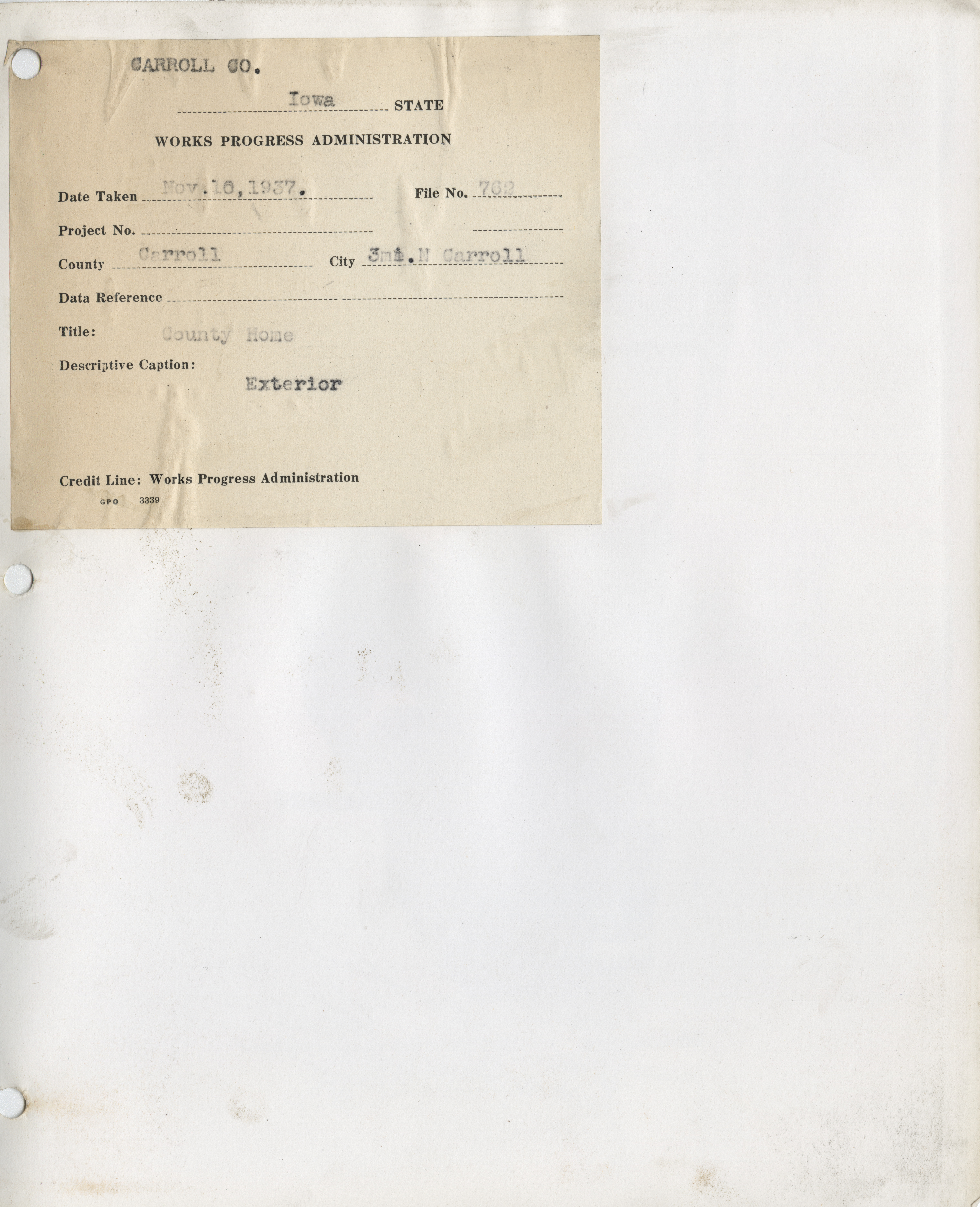 - "Photograph of the exterior of the Carroll County Home", Work Projects Administration (Iowa) Photographs, Iowa State University Library Digital Collections