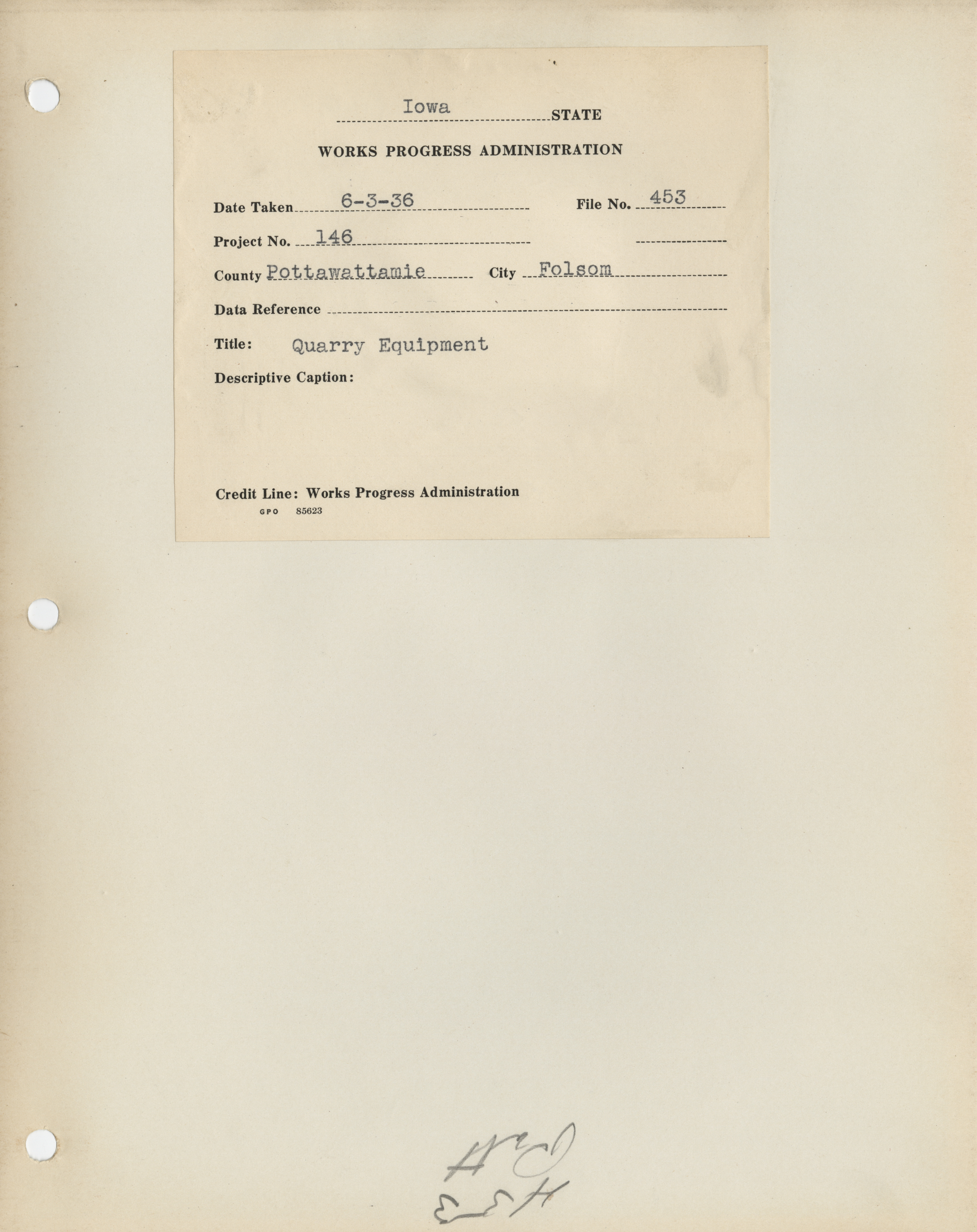 - District 5. Pottawattamie County. Folsom. Quarry Equipment. Project 146. (1 b/w photograph), 1936