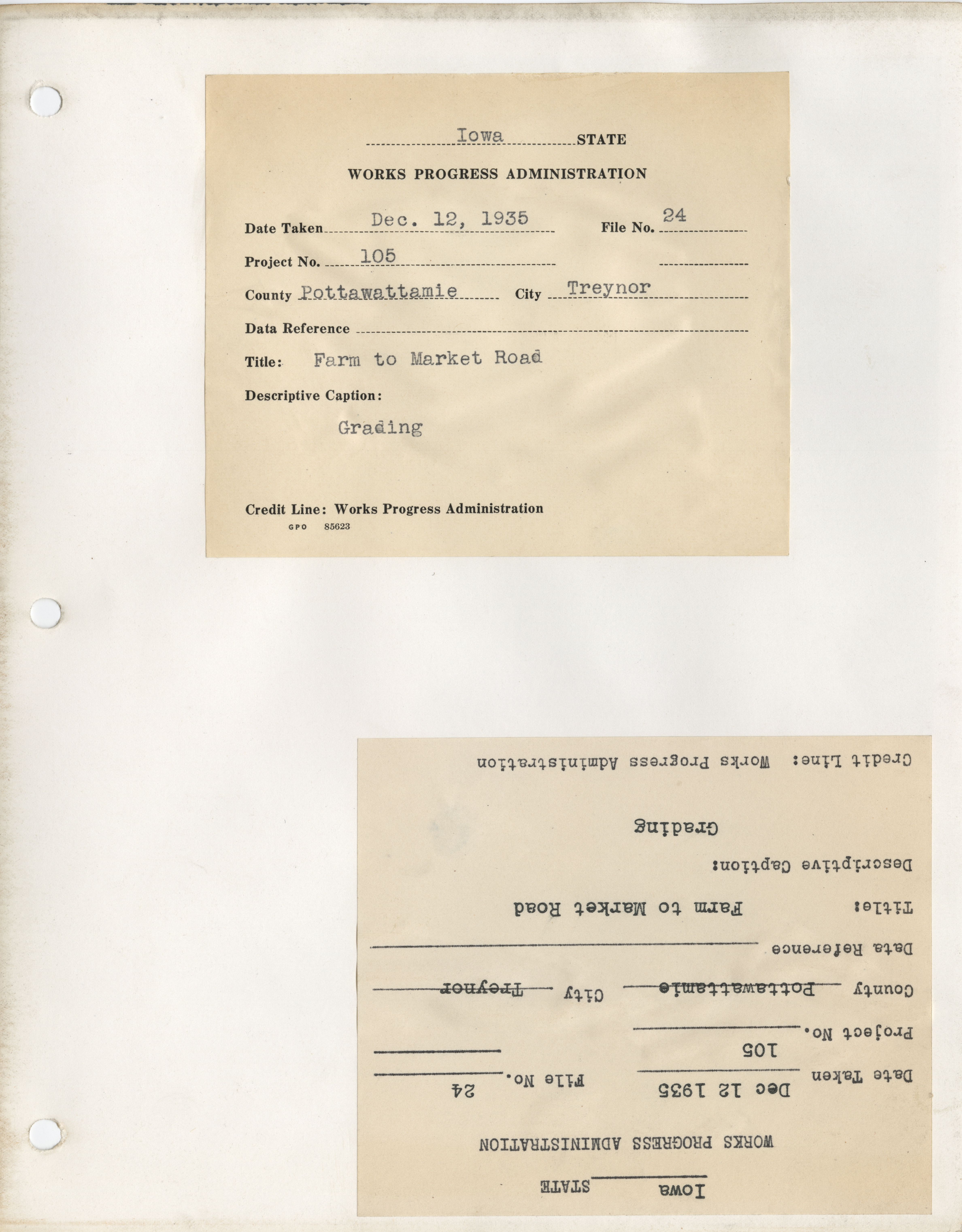 - "Photograph of people grading a farm to market road in Pottawattamie County", Work Projects Administration (Iowa) Photographs, Iowa State University Library Digital Collections