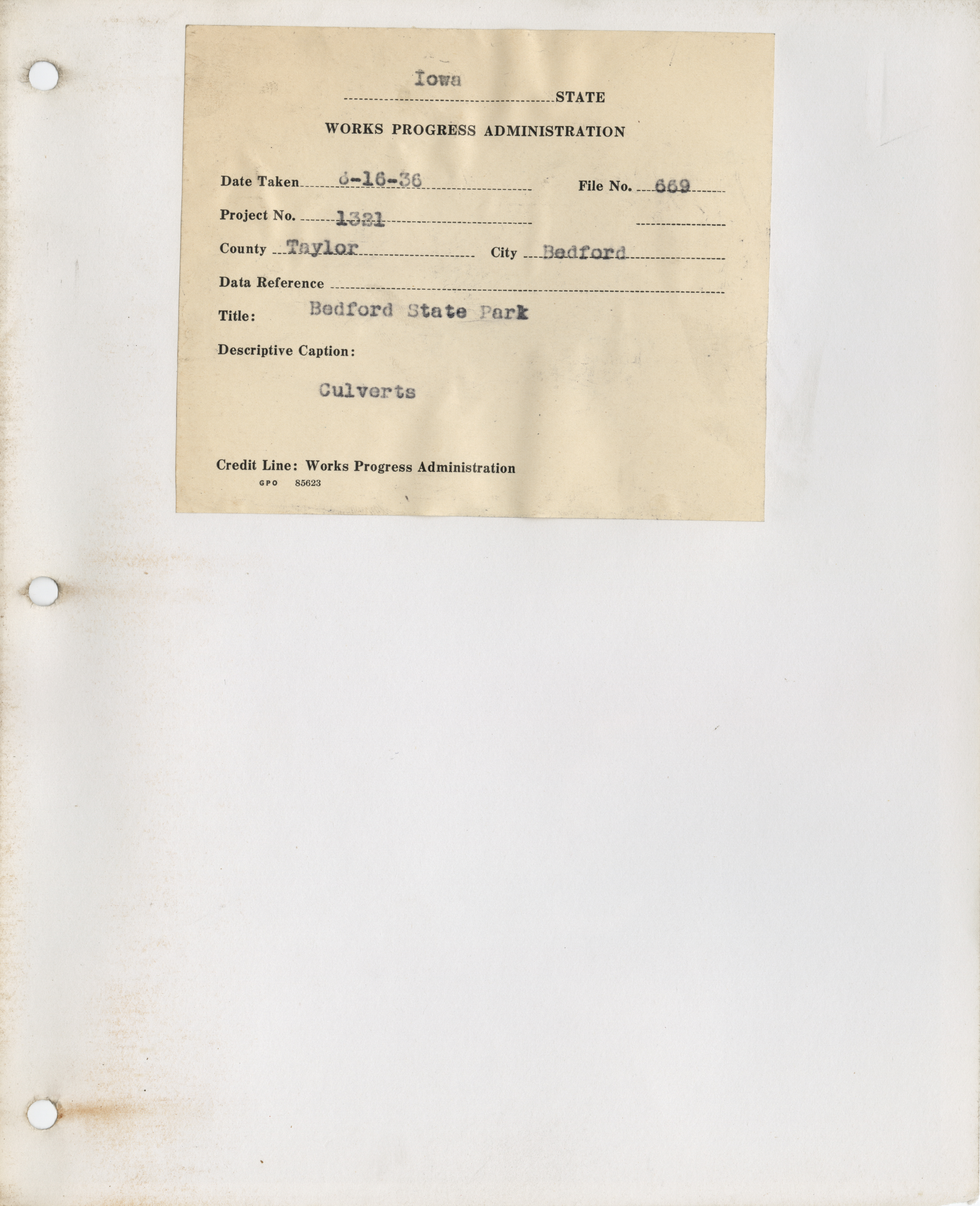 - "Photograph of two people inspecting culverts at Bedford State Park in Taylor County", Work Projects Administration (Iowa) Photographs, Iowa State University Library Digital Collections