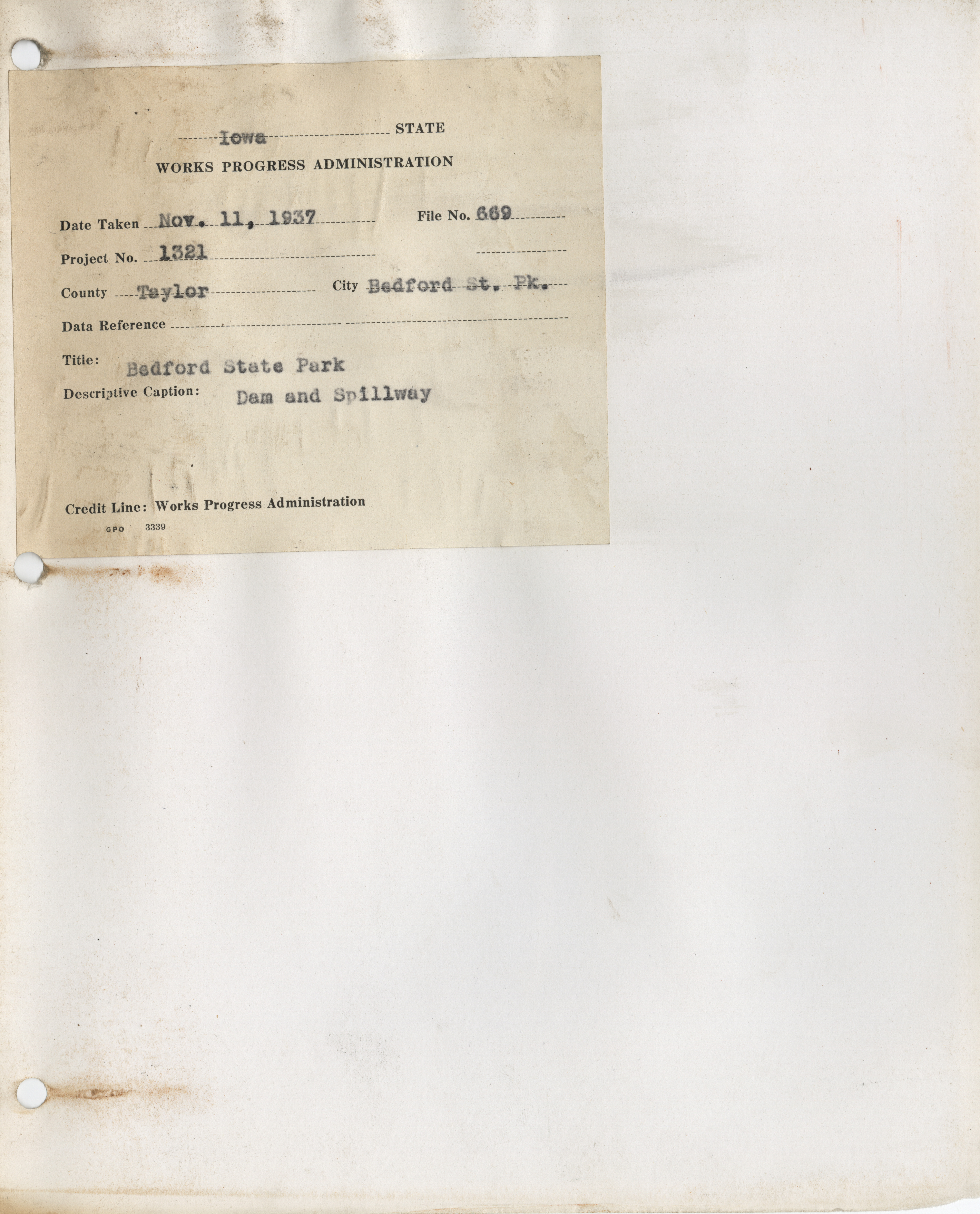 - "Photograph of dam and spillway at Bedford State Park in Taylor County", Work Projects Administration (Iowa) Photographs, Iowa State University Library Digital Collections