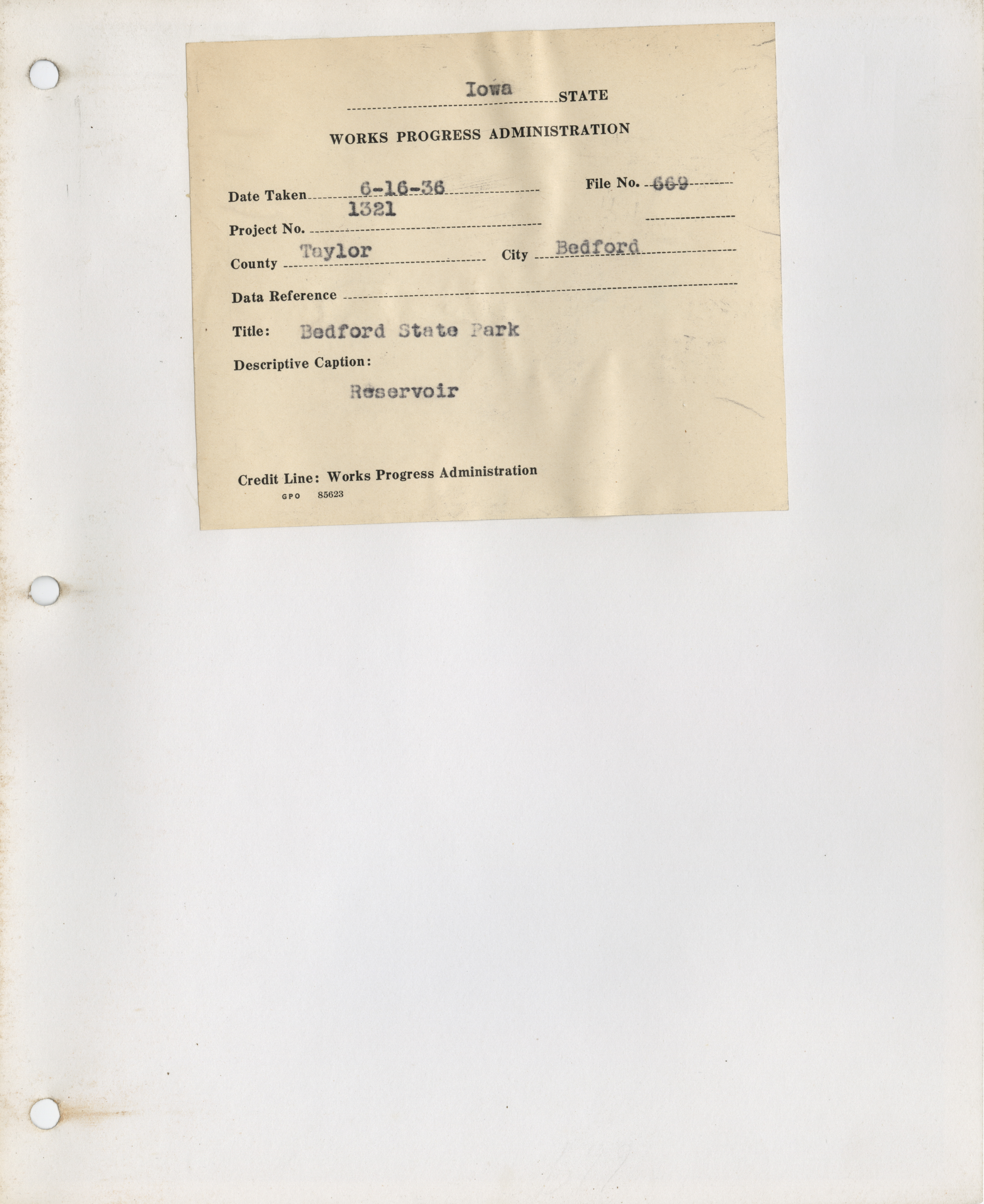 - "Photograph of reservoir at Bedford State park in Taylor County", Work Projects Administration (Iowa) Photographs, Iowa State University Library Digital Collections