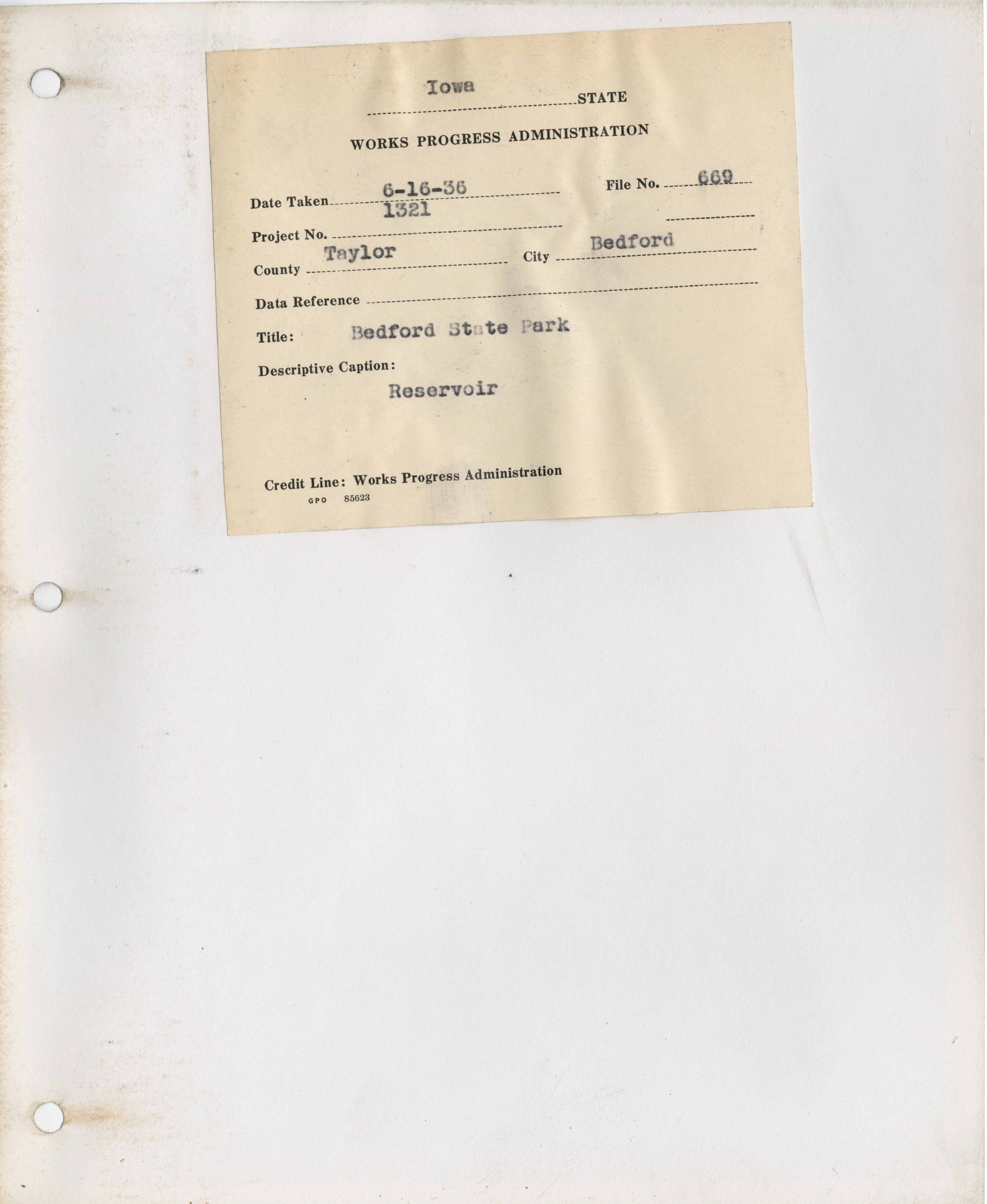 - "Photograph of reservoir at Bedford State park in Taylor County", Work Projects Administration (Iowa) Photographs, Iowa State University Library Digital Collections