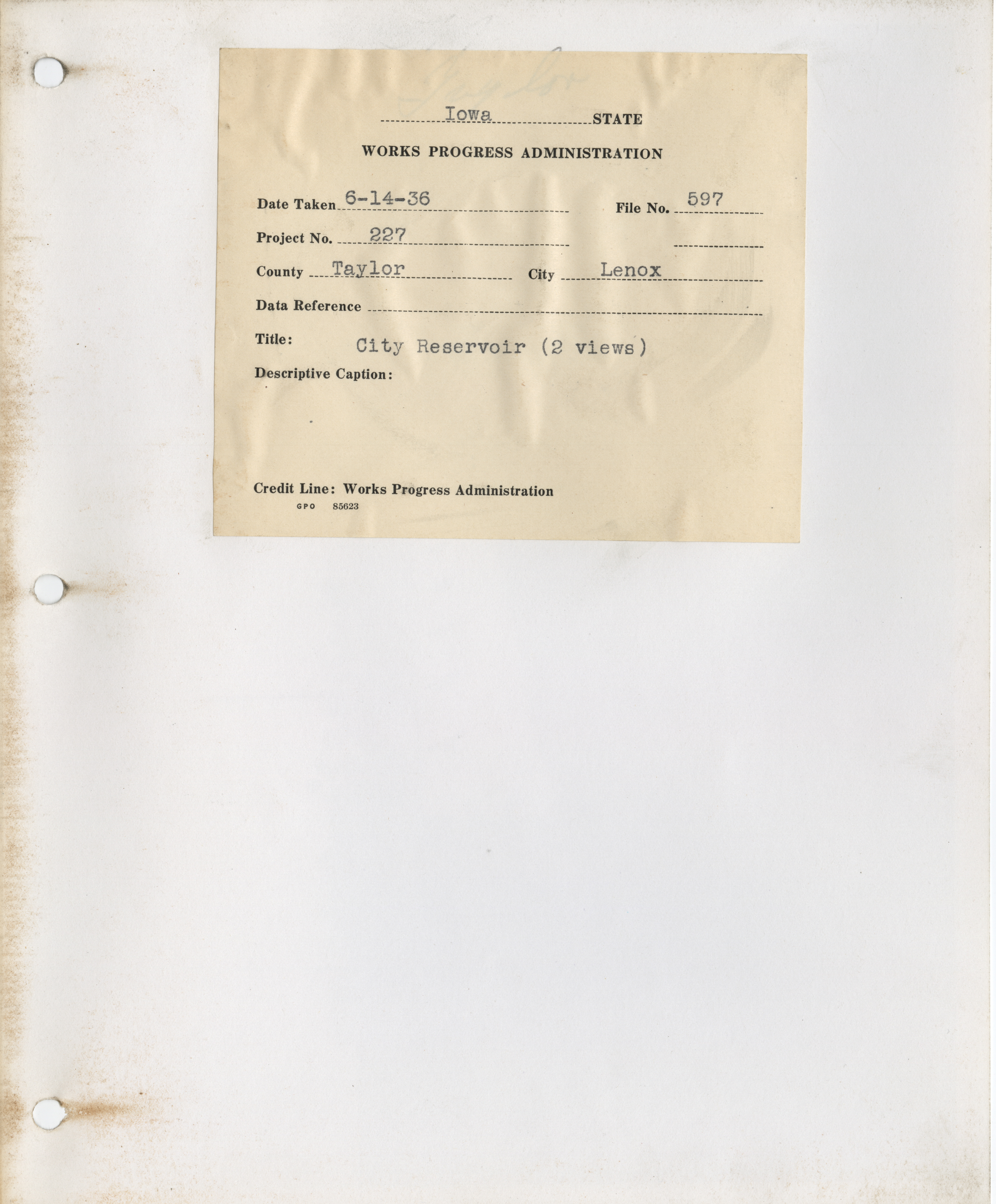 - District 5. Shelby County. Lenox. City Reservoir. Project 227. (3 b/w photographs), 1936-1937