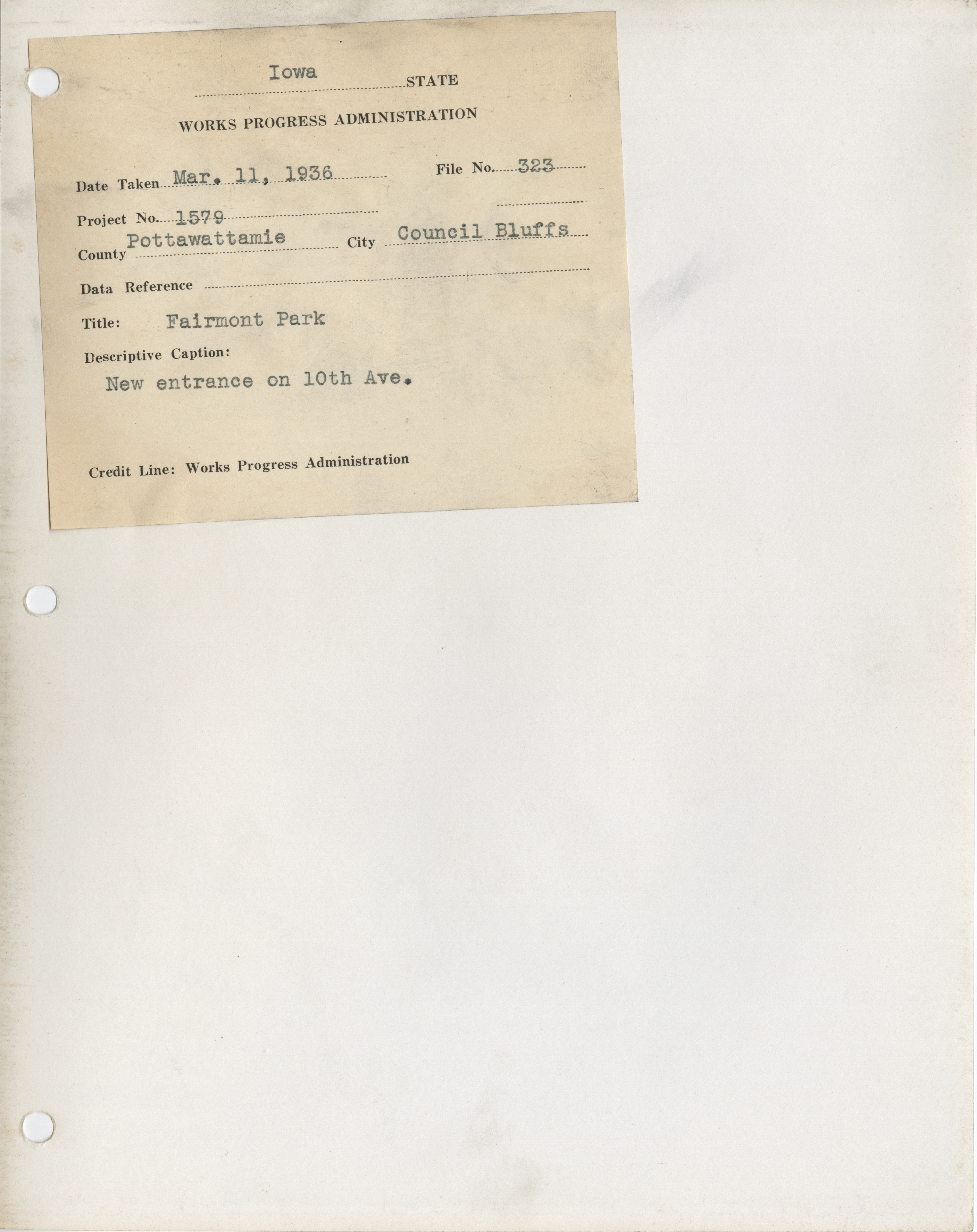 - "Photograph of people constructing a new entrance to Fairmount Park on 10th Ave. in Council Bluffs", Work Projects Administration (Iowa) Photographs, Iowa State University Library Digital Collections