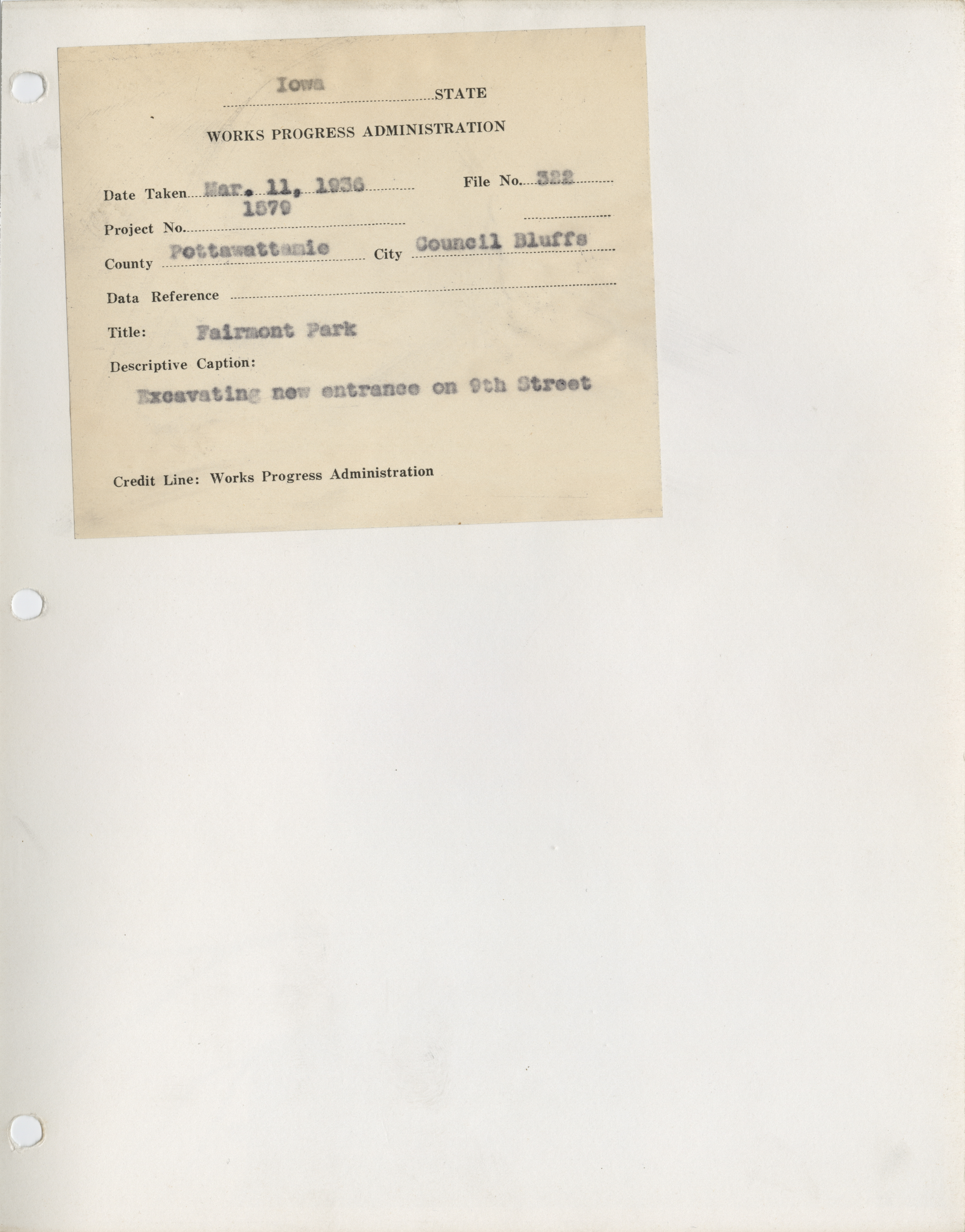 - "Photograph of people excavating a new entrance to Fairmount Park on 9th Street in Council Bluffs", Work Projects Administration (Iowa) Photographs, Iowa State University Library Digital Collections
