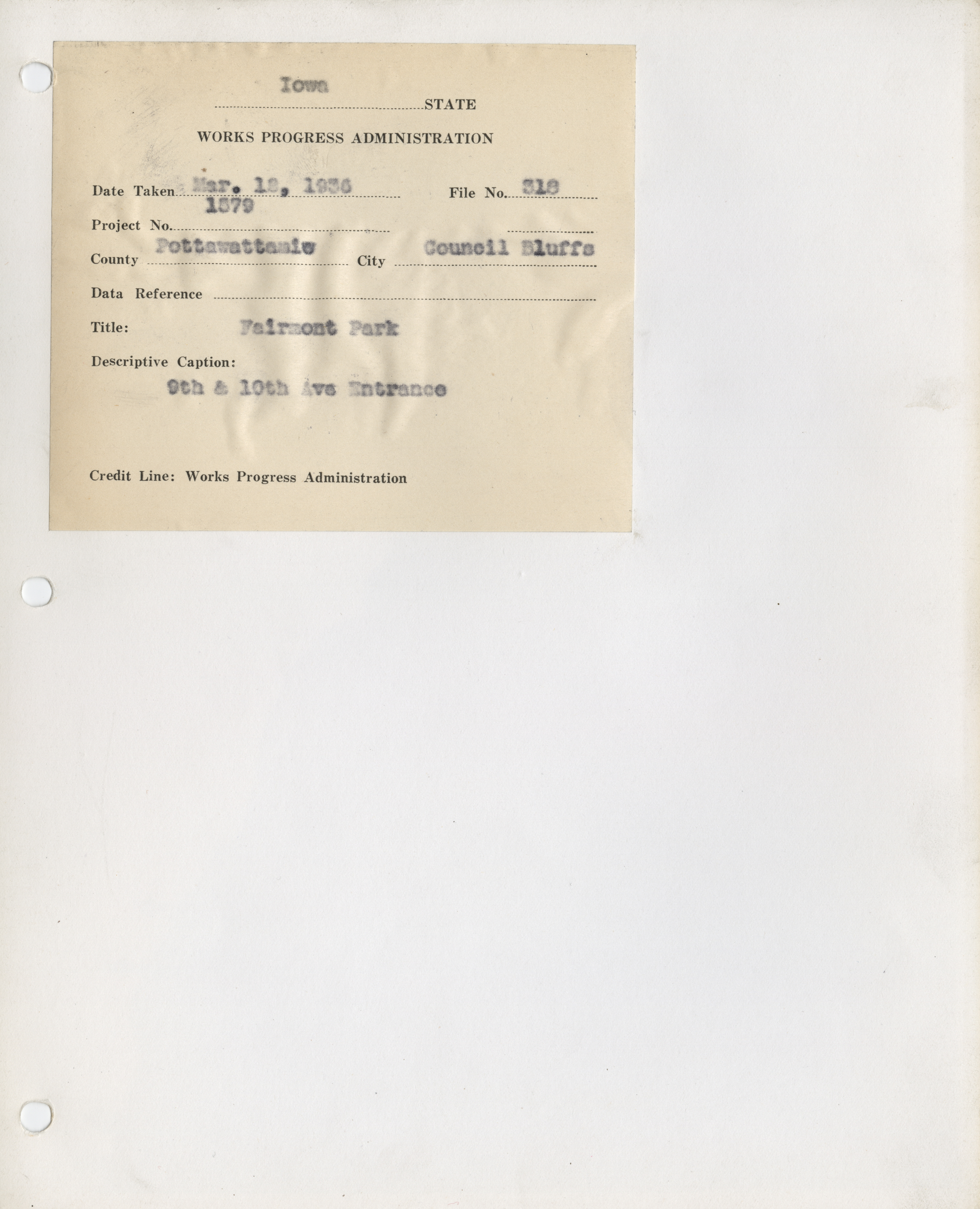 - "Photograph of people constructing an entrance to Fairmount Park in Council Bluffs", Work Projects Administration (Iowa) Photographs, Iowa State University Library Digital Collections
