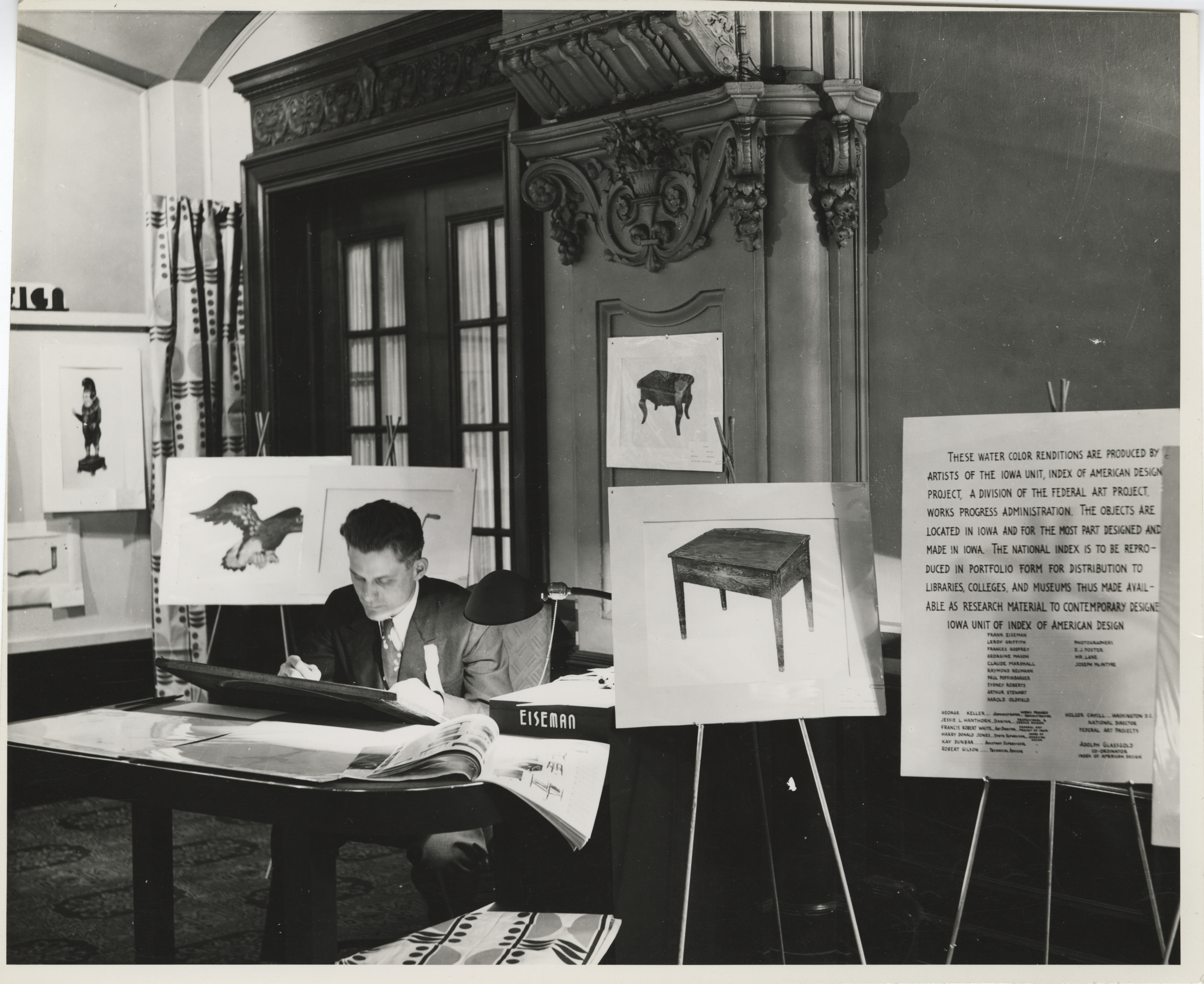 - "Photograph of a person sitting at a desk surrounded by watercolors depicting Iowa objects", Work Projects Administration (Iowa) Photographs, Iowa State University Library Digital Collections