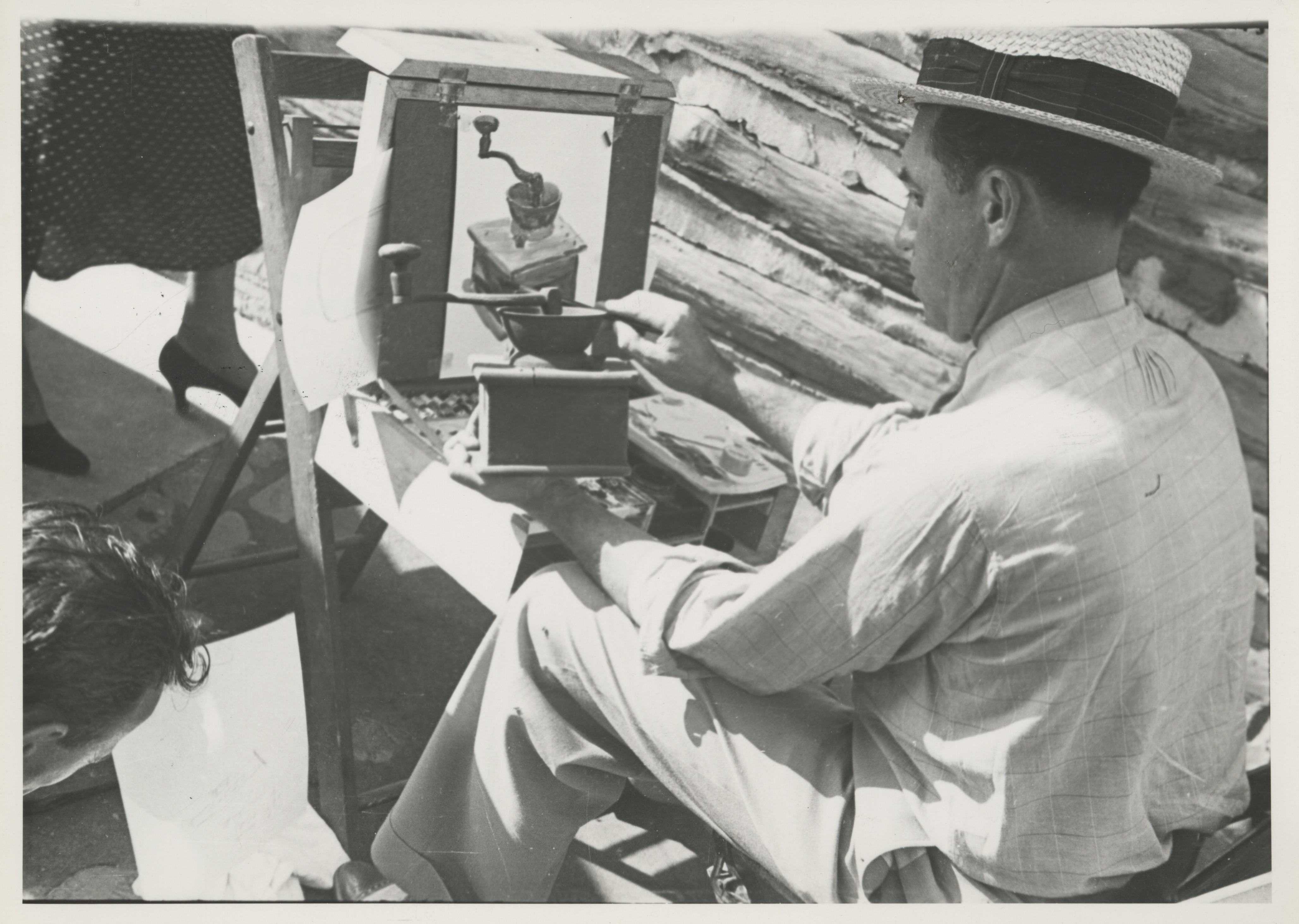 Photograph of a person painting an image of a hand crank grinder Item Info
