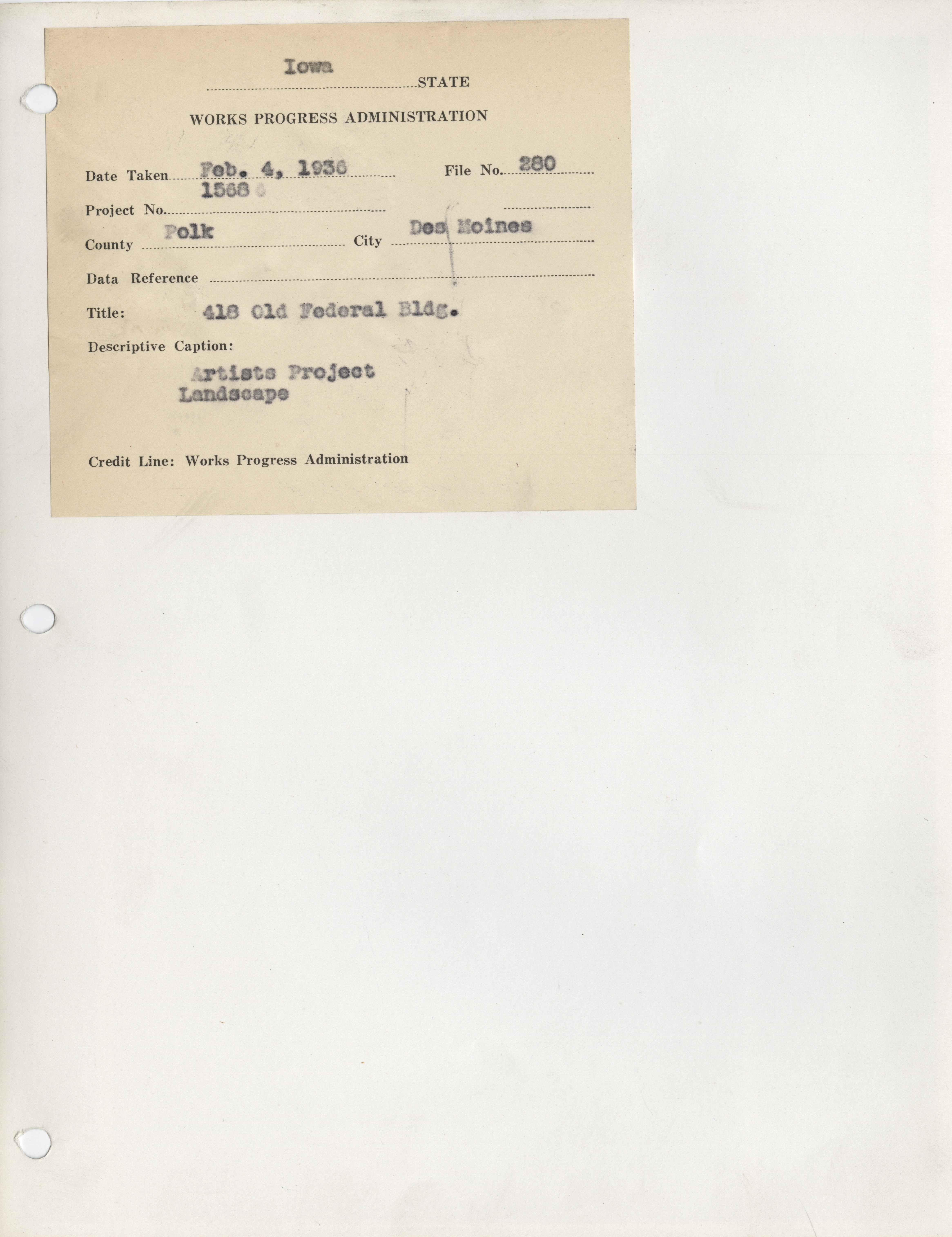 - Art Projects. Polk County. Des Moines. Old Federal Building. Project 1568. (6 b/w photographs), 1936