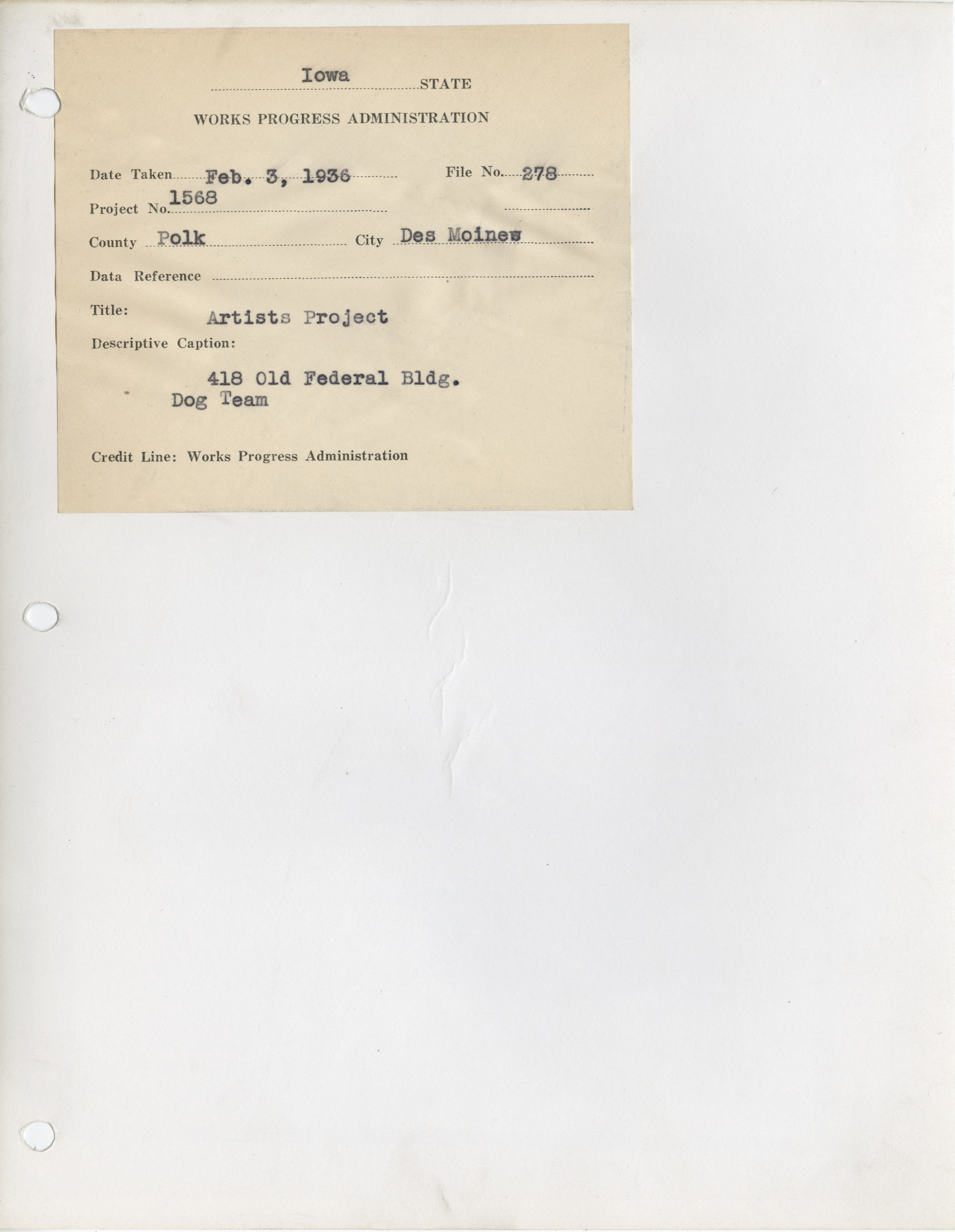 - "Photograph of a drawing of a dog team exhibited at 418 Old Federal Building in Des Moines", Work Projects Administration (Iowa) Photographs, Iowa State University Library Digital Collections