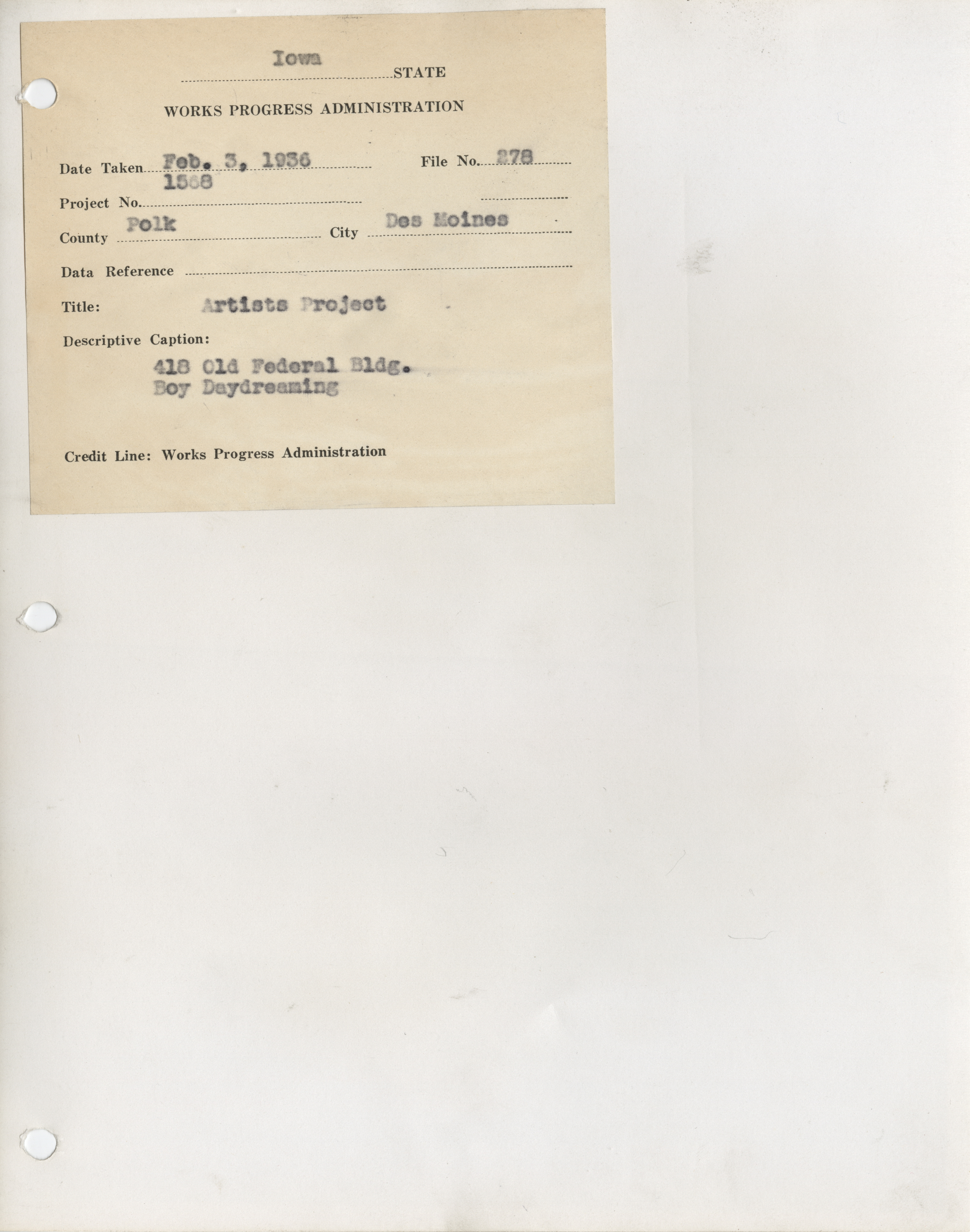 - "Photograph of a drawing of a boy daydreaming exhibited at 418 Old Federal Building in Des Moines", Work Projects Administration (Iowa) Photographs, Iowa State University Library Digital Collections