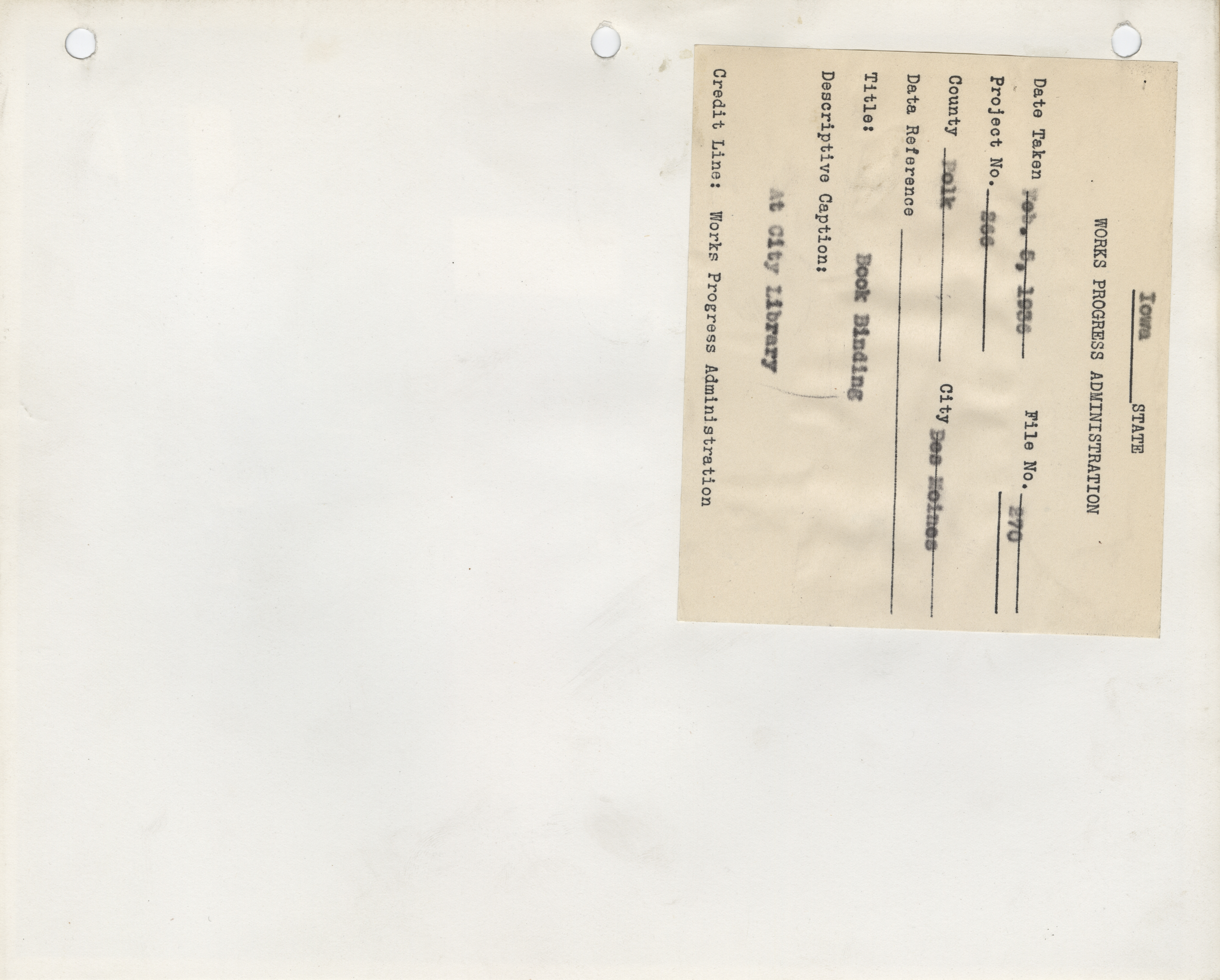 - "Photograph of bookbinding at the city library in Des Moines", Work Projects Administration (Iowa) Photographs, Iowa State University Library Digital Collections