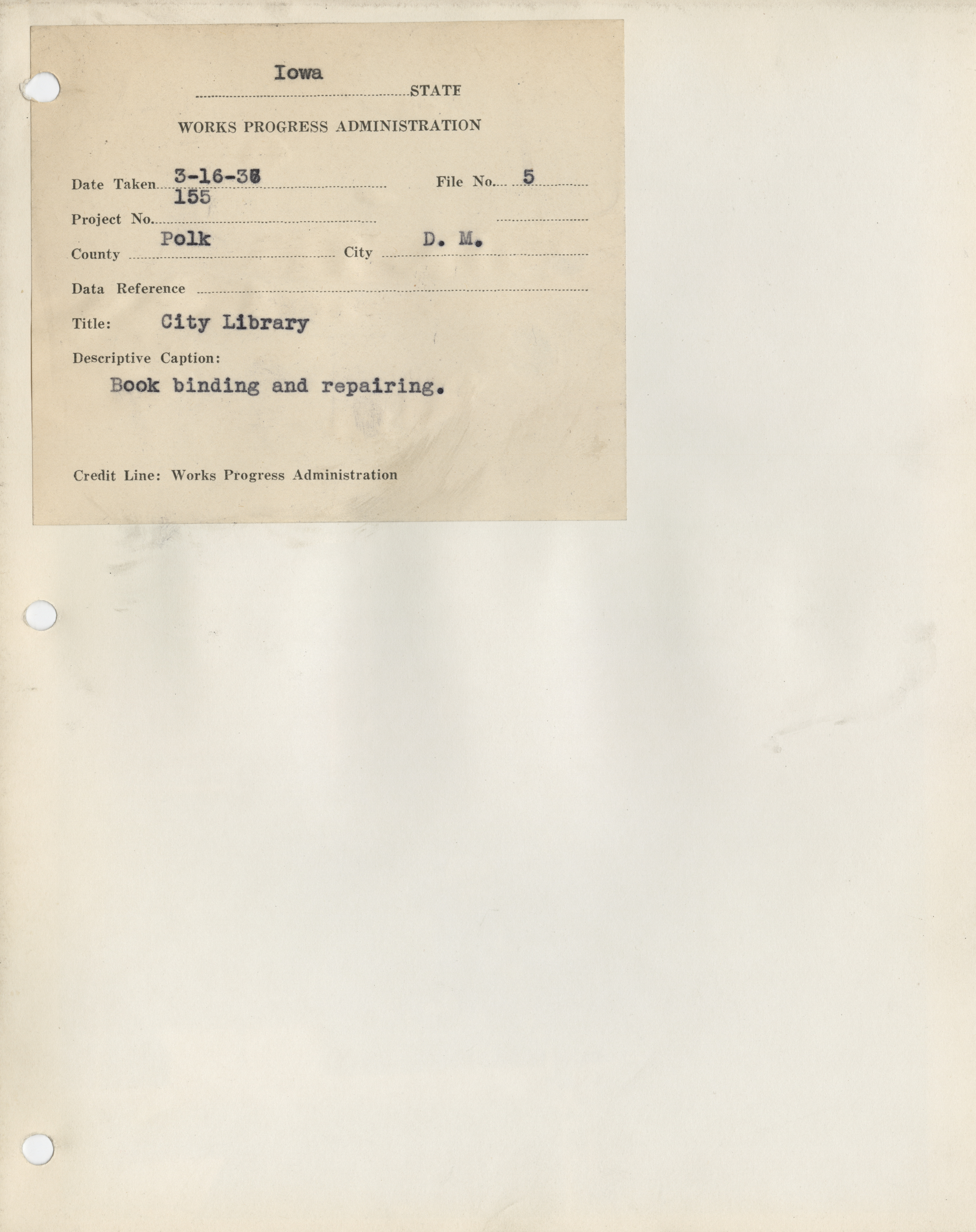 - "Photograph of bookbinding and repair at the city library in Des Moines", Work Projects Administration (Iowa) Photographs, Iowa State University Library Digital Collections