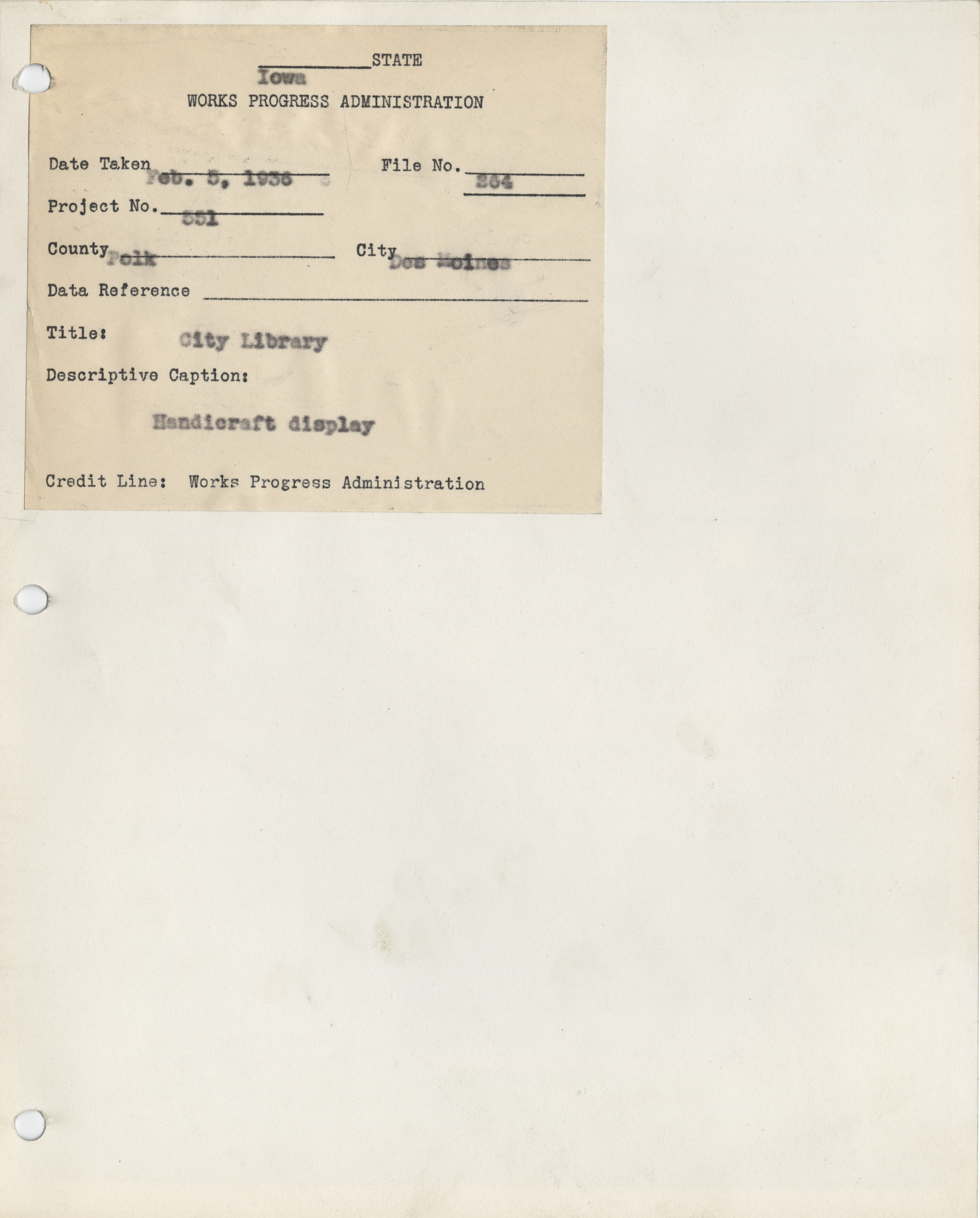- "Photograph of a handicraft display at the city library in Des Moines", Work Projects Administration (Iowa) Photographs, Iowa State University Library Digital Collections