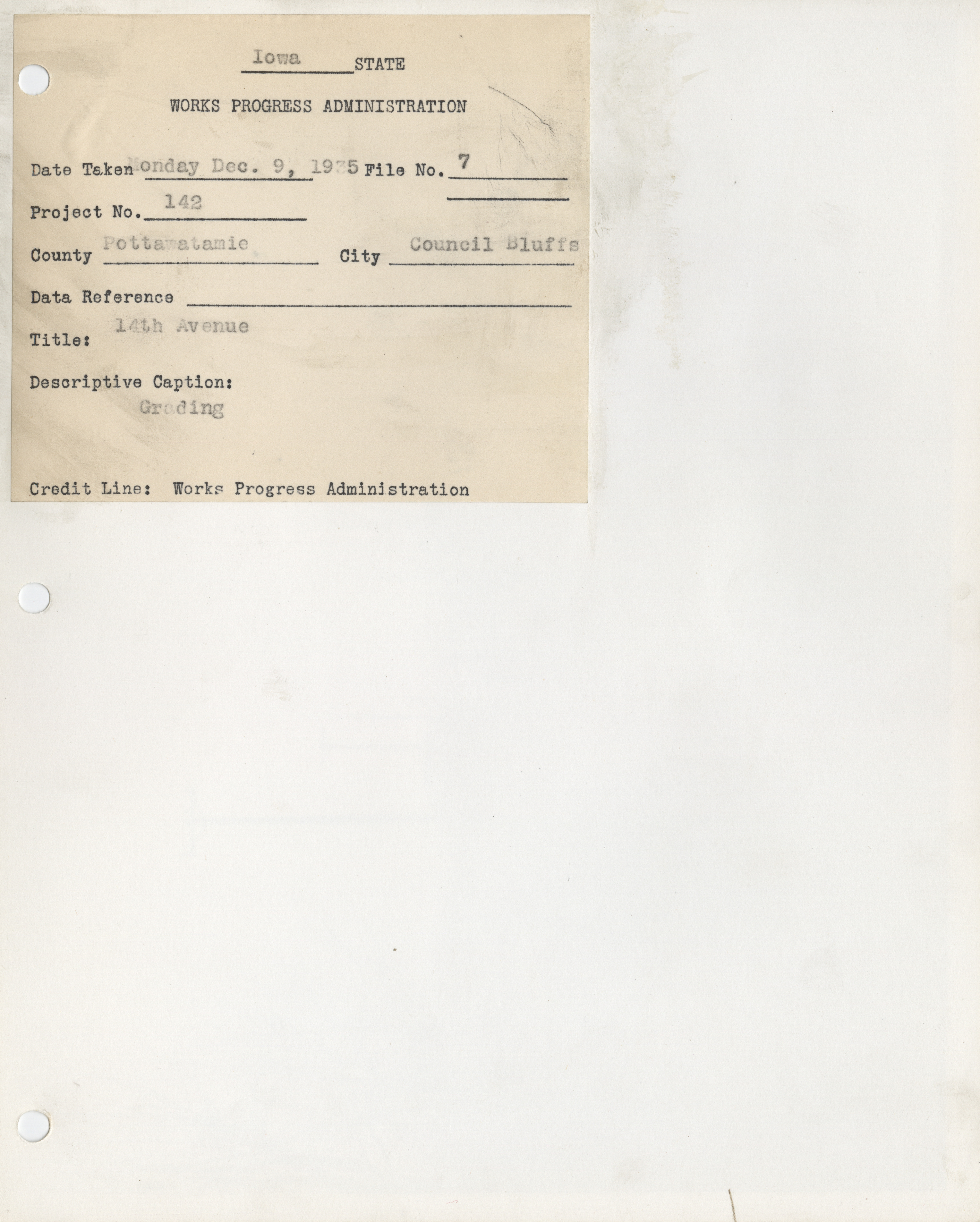 - District 5. Pottawattamie County. Council Bluffs. Grading 14th Avenue. Project 142. (1 b/w photograph), 1935
