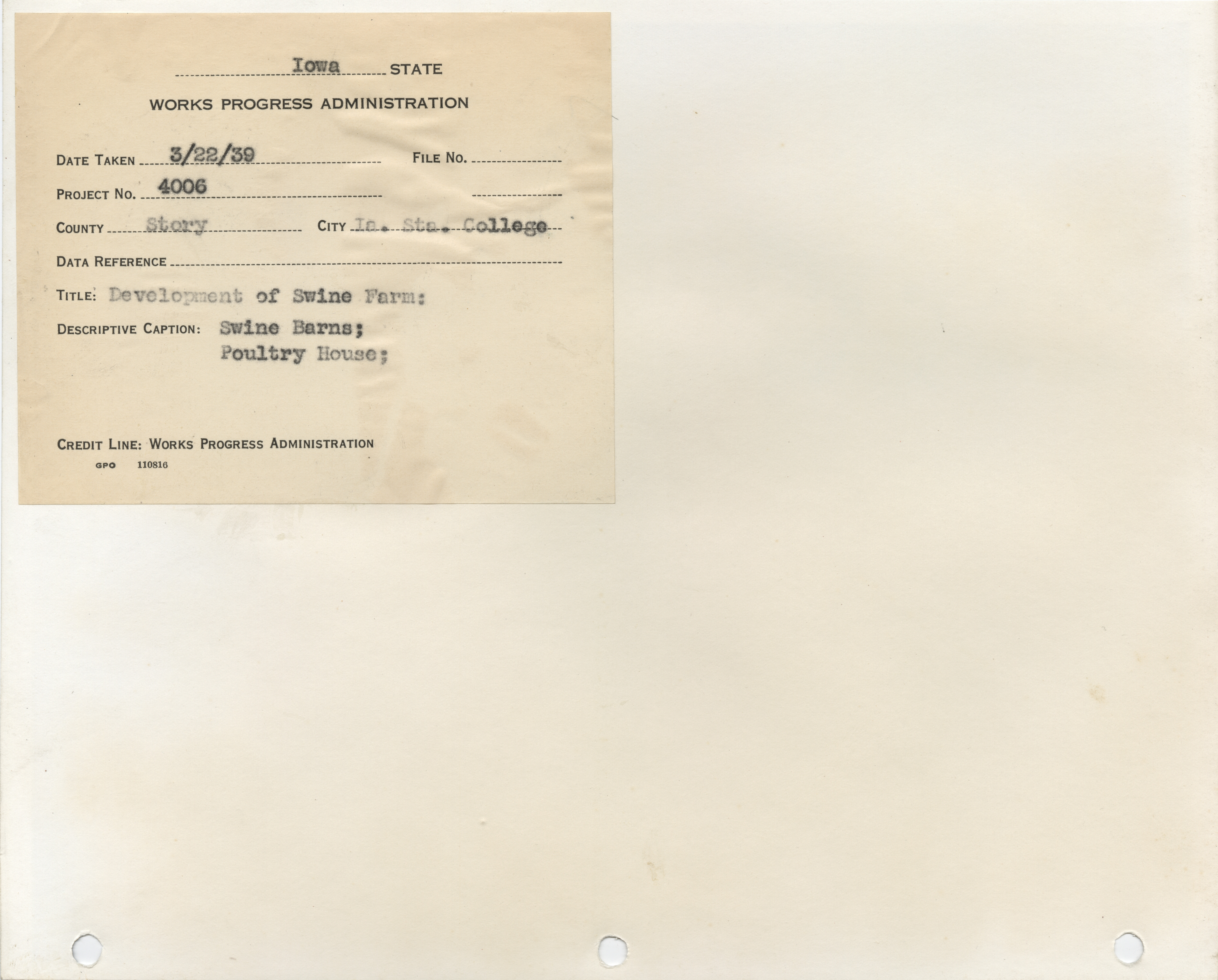- "Photograph of buildings on the swine farm at Iowa State College in Story County", Work Projects Administration (Iowa) Photographs, Iowa State University Library Digital Collections