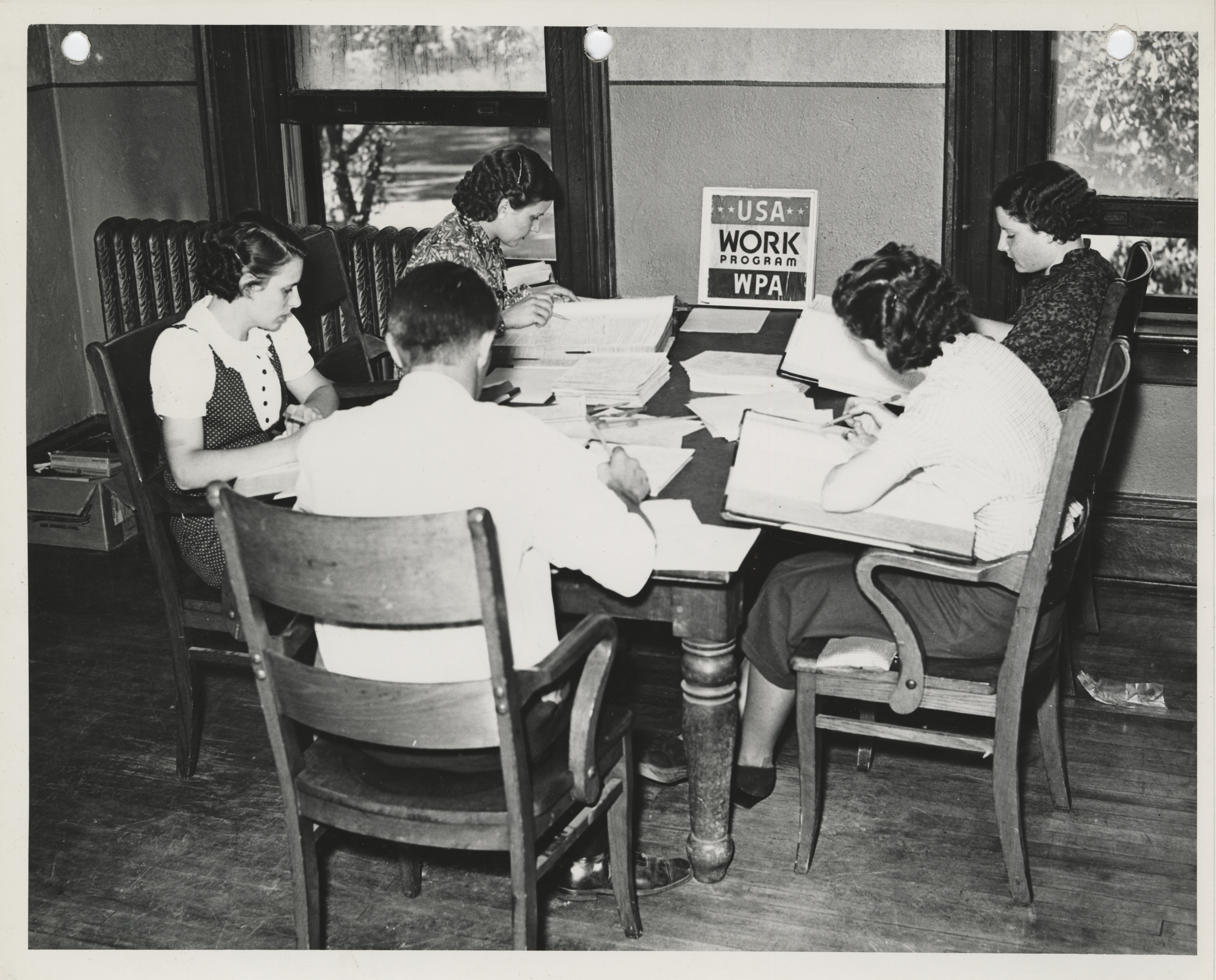 - "Photograph of people surveying farm records in Spencer", Work Projects Administration (Iowa) Photographs, Iowa State University Library Digital Collections