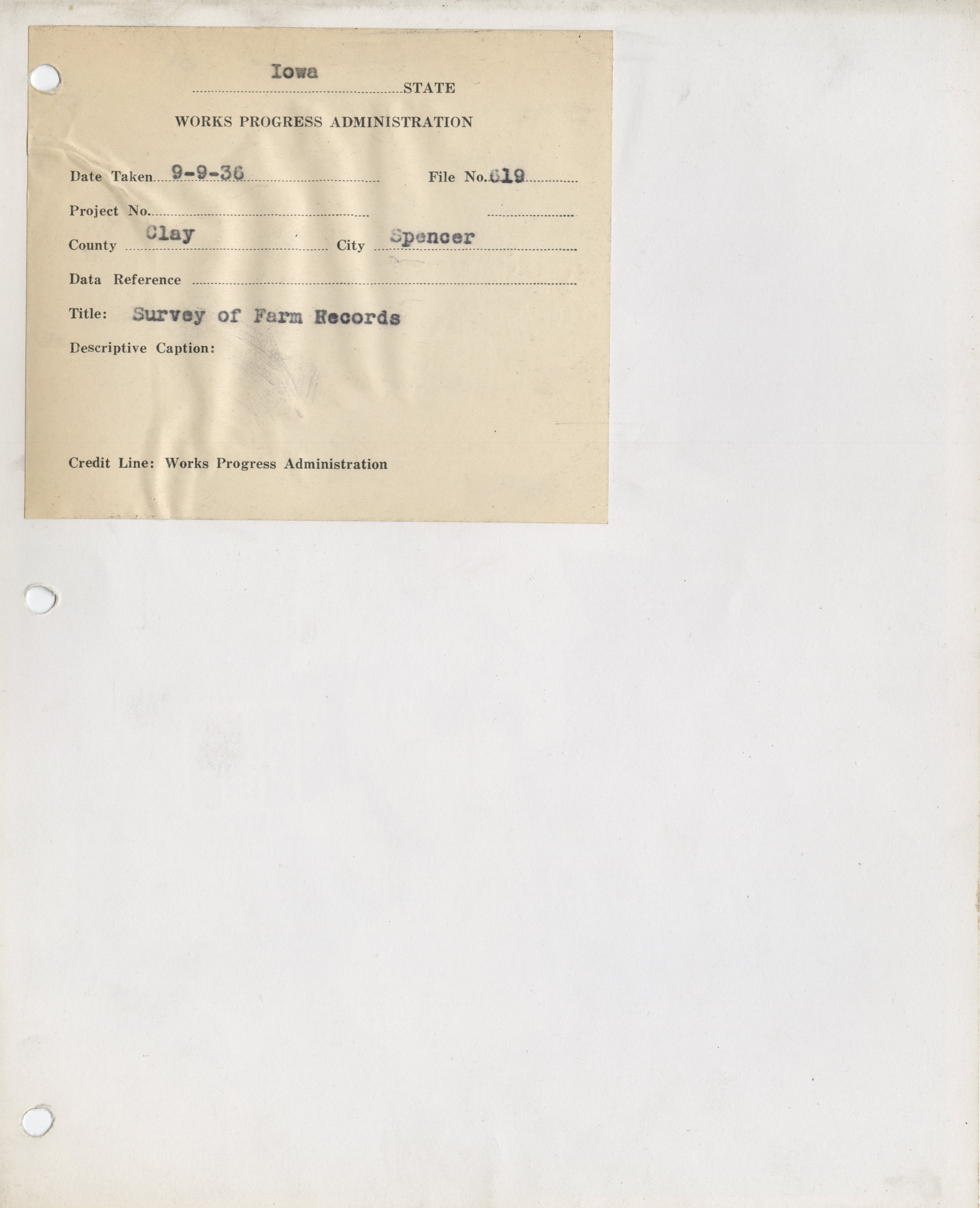 - Clerical--Statistical. Clay County. Spencer. Survey of Farm Records. (1 b/w photograph), 1936