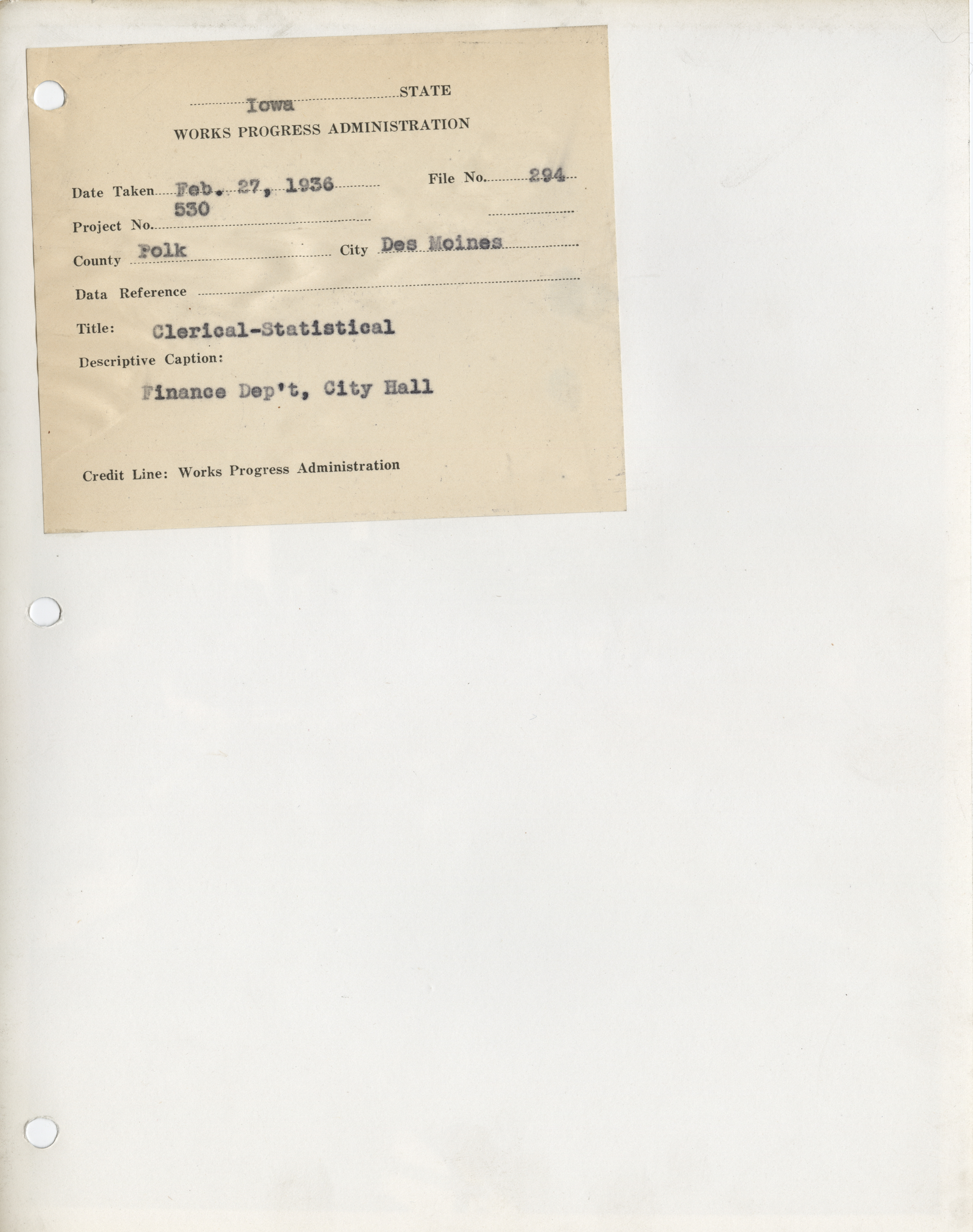 - Clerical--Statistical. Polk County. Des Moines. Finance Department, City Hall. Project 530. (2 b/w photographs), 1936