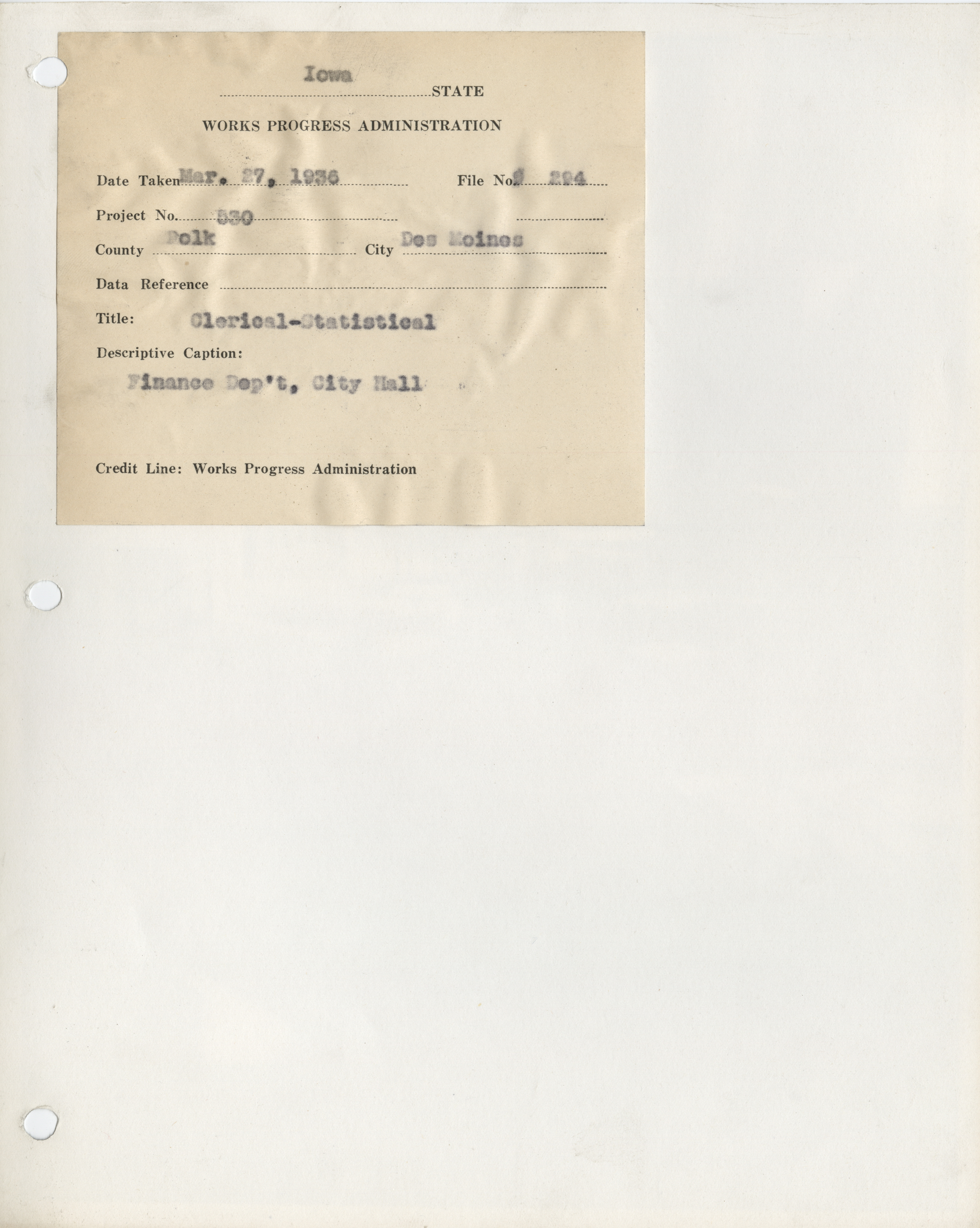 - Clerical--Statistical. Polk County. Des Moines. Finance Department, City Hall. Project 530. (2 b/w photographs), 1936