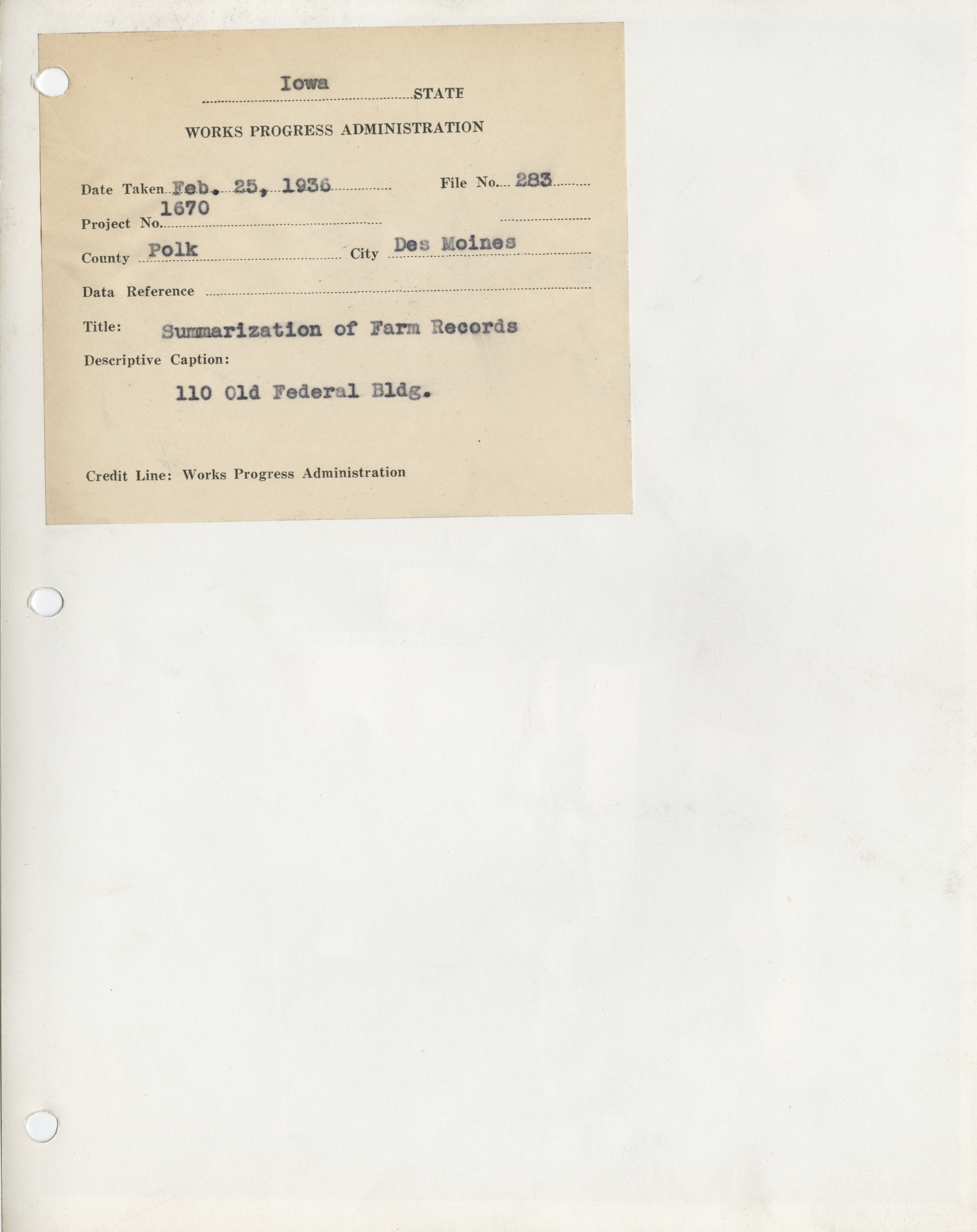 - "Photograph of people summarizing farm records at 110 Old Federal Building in Des Moines", Work Projects Administration (Iowa) Photographs, Iowa State University Library Digital Collections