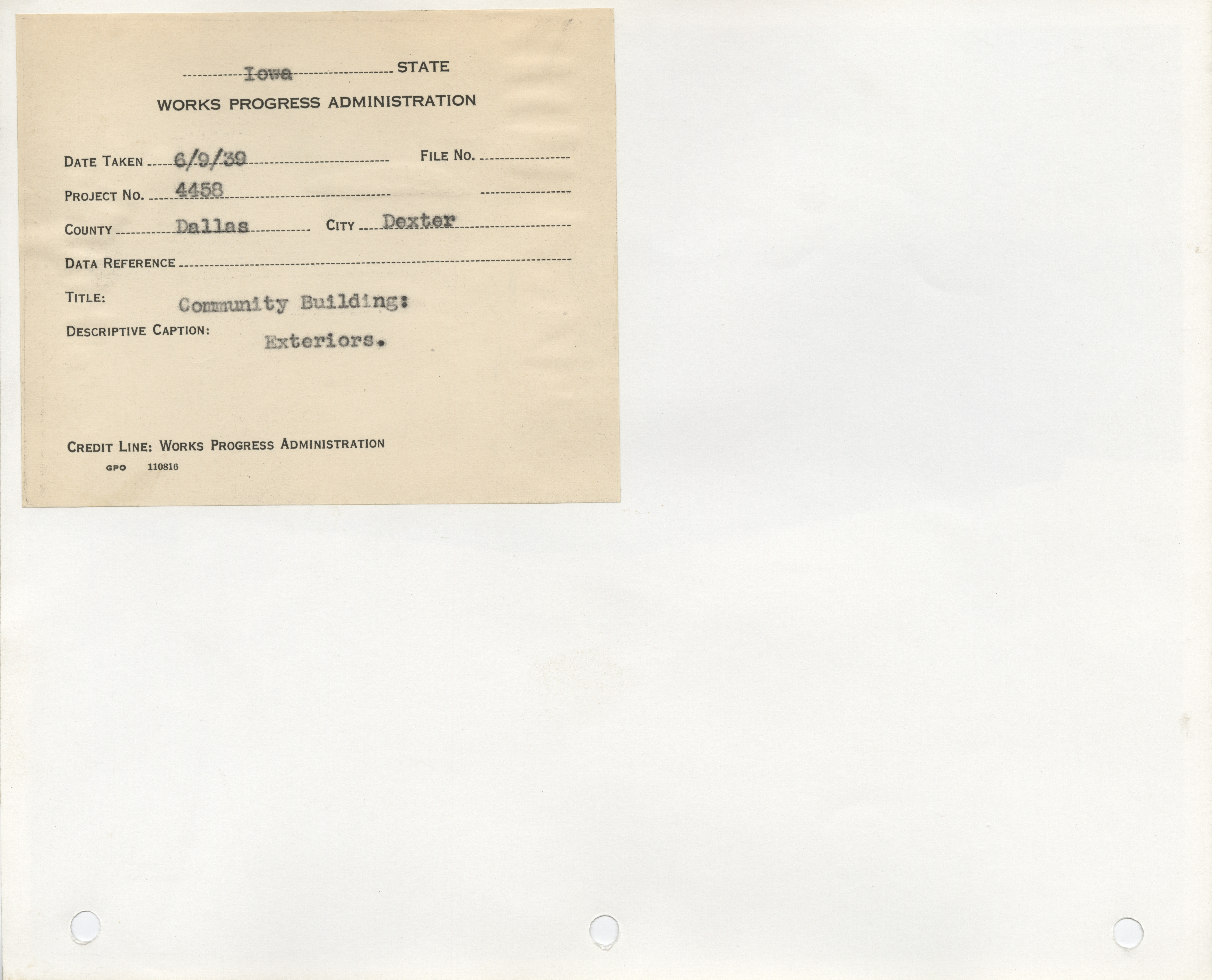 - Community Buildings. Dallas County. Dexter. Community Buildings. Project 4458. (2 b/w photographs), 1939