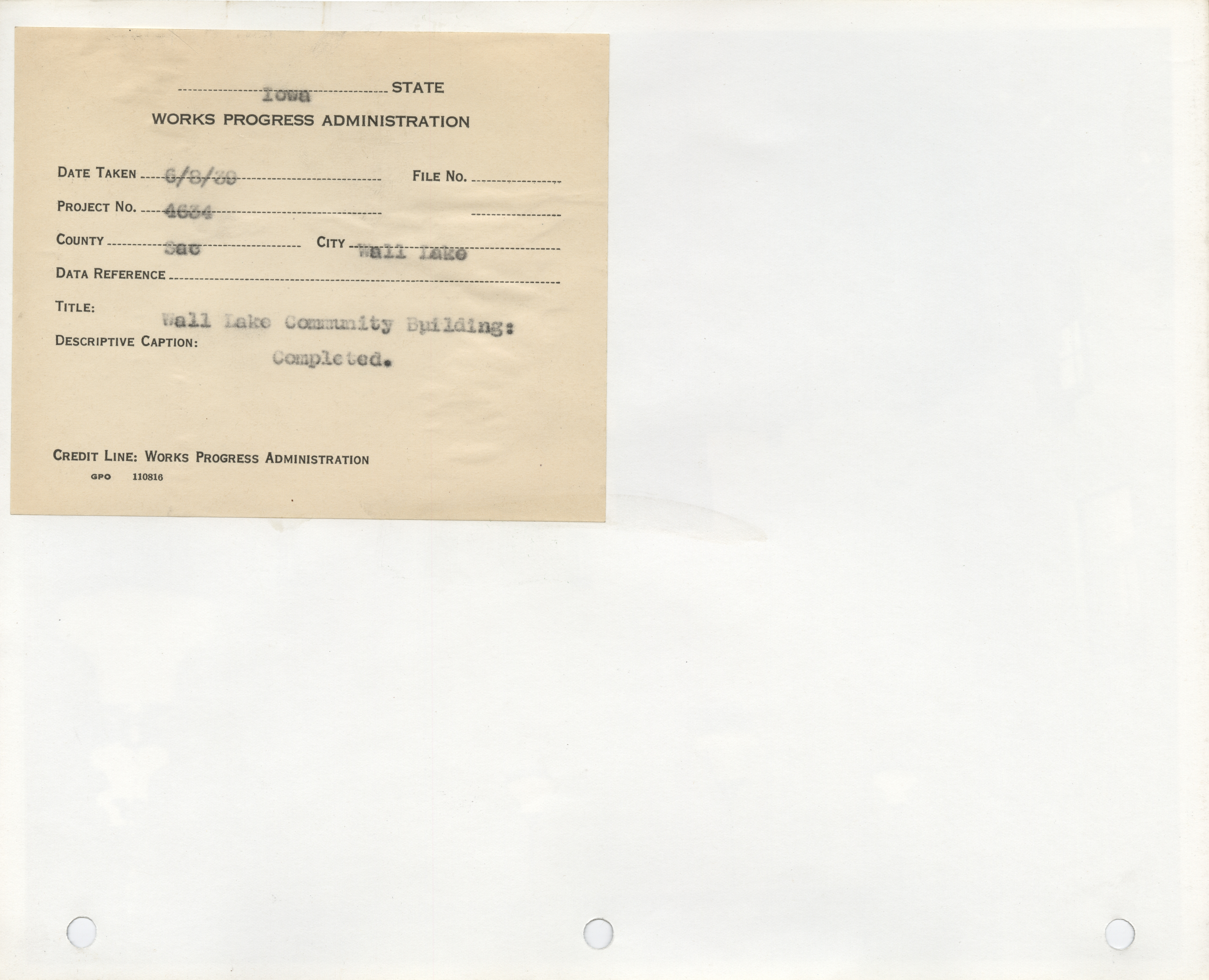 - Community Buildings. Sac County. Wall Lake. Community Building. Project 4634. (2 b/w photographs), 1939