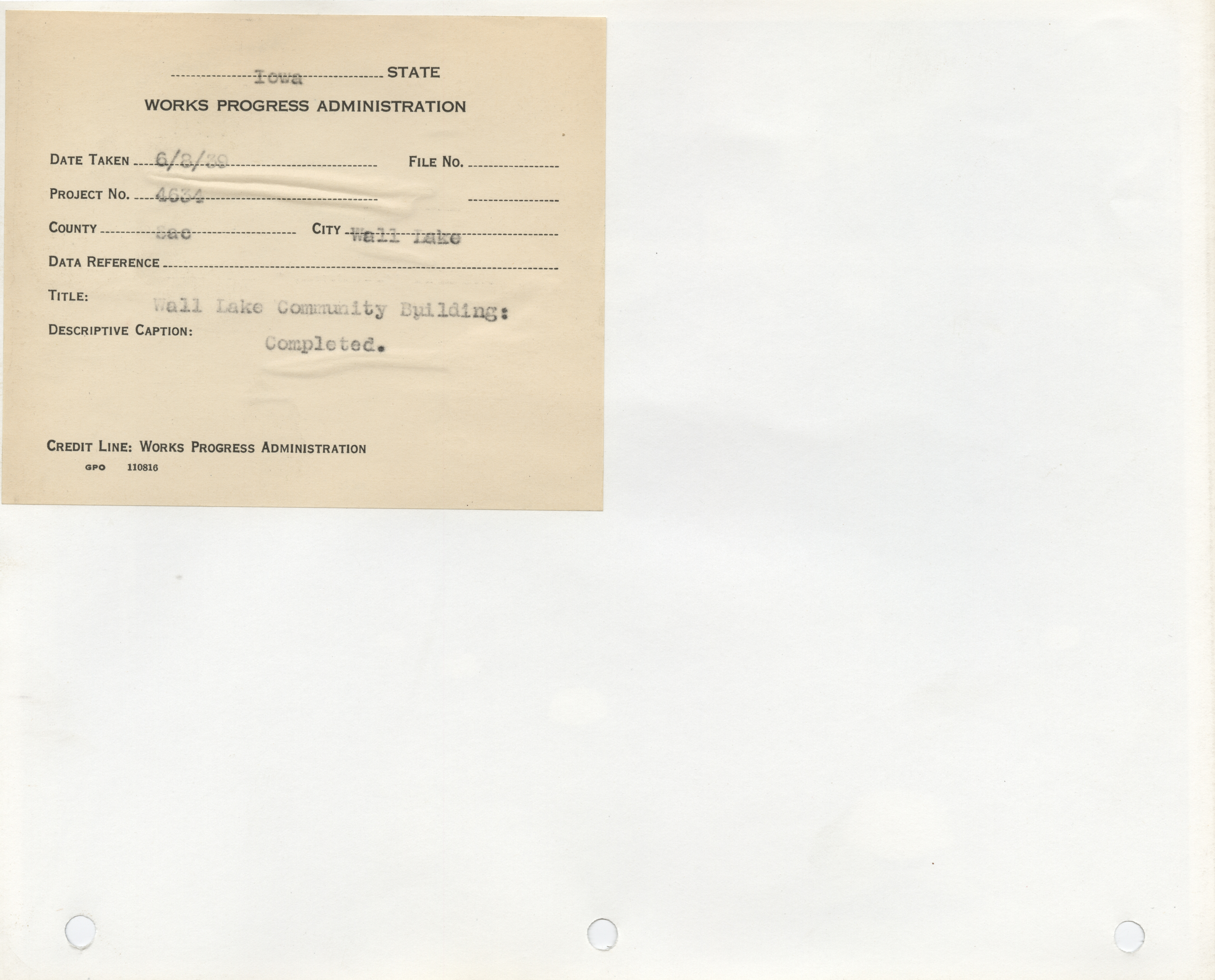 - Community Buildings. Sac County. Wall Lake. Community Building. Project 4634. (2 b/w photographs), 1939