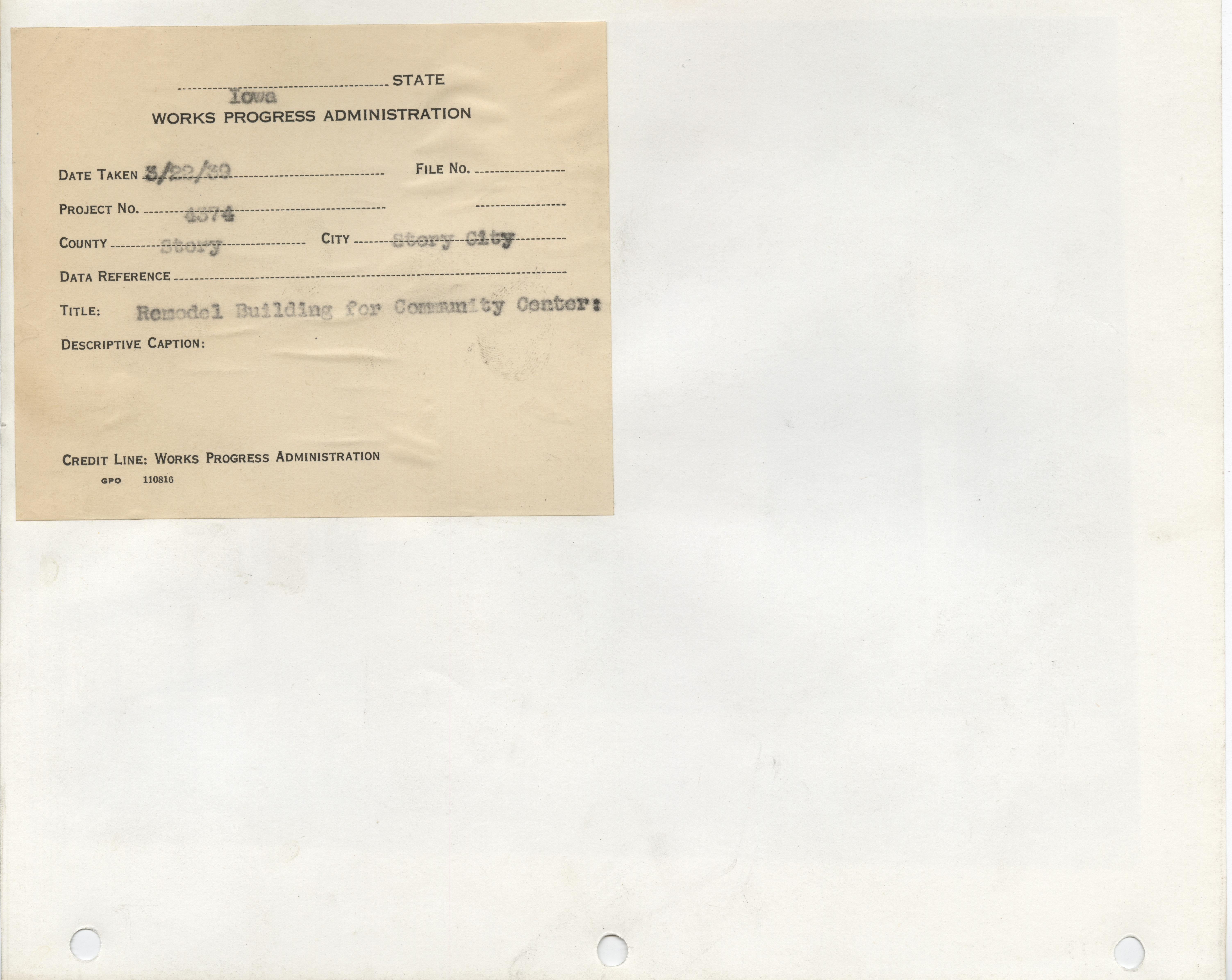 - Community Buildings. Story County. Story City. Building Remodeled for Community Center. Project 4347. (3 b/w photographs), 1939