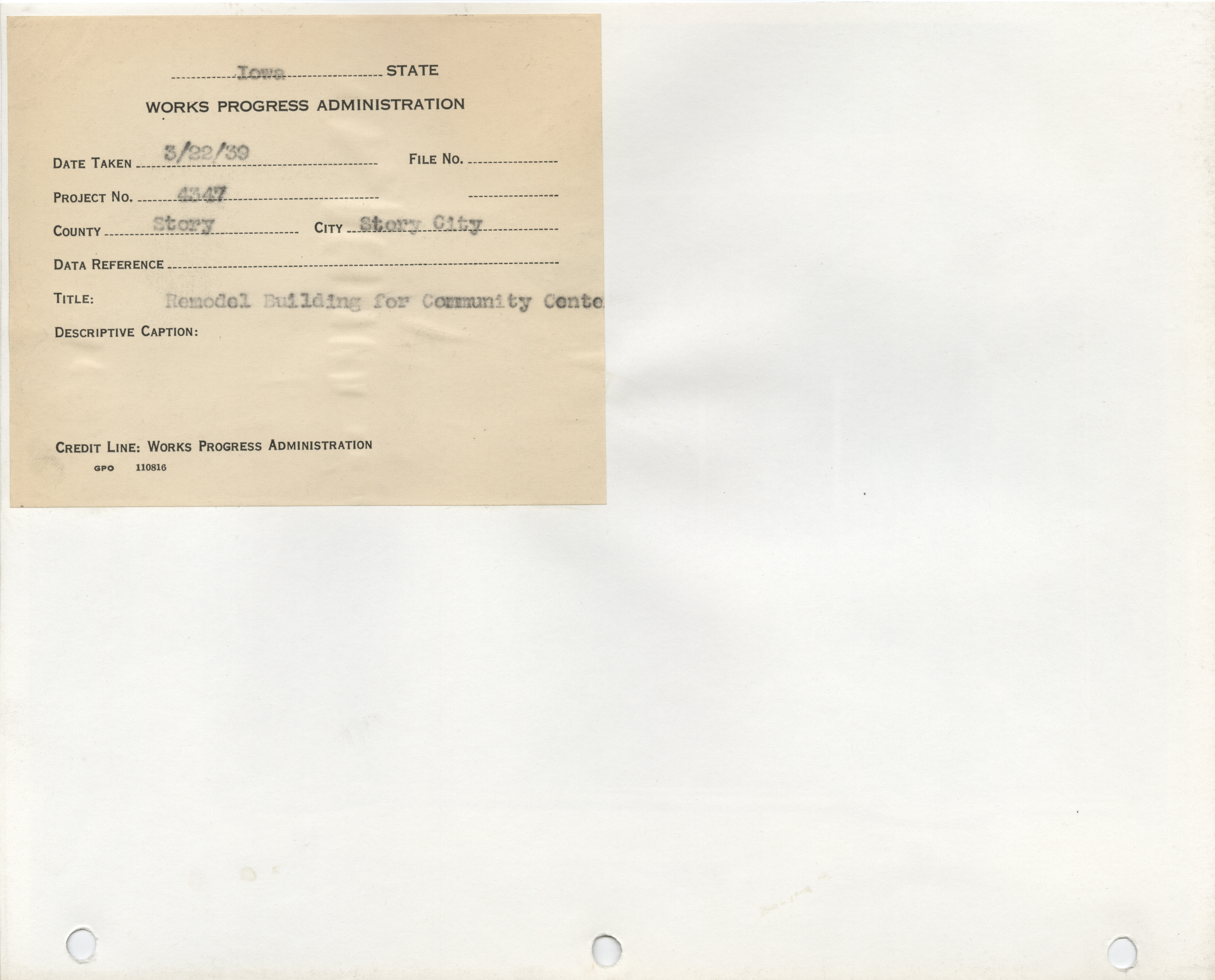 - Community Buildings. Story County. Story City. Building Remodeled for Community Center. Project 4347. (3 b/w photographs), 1939