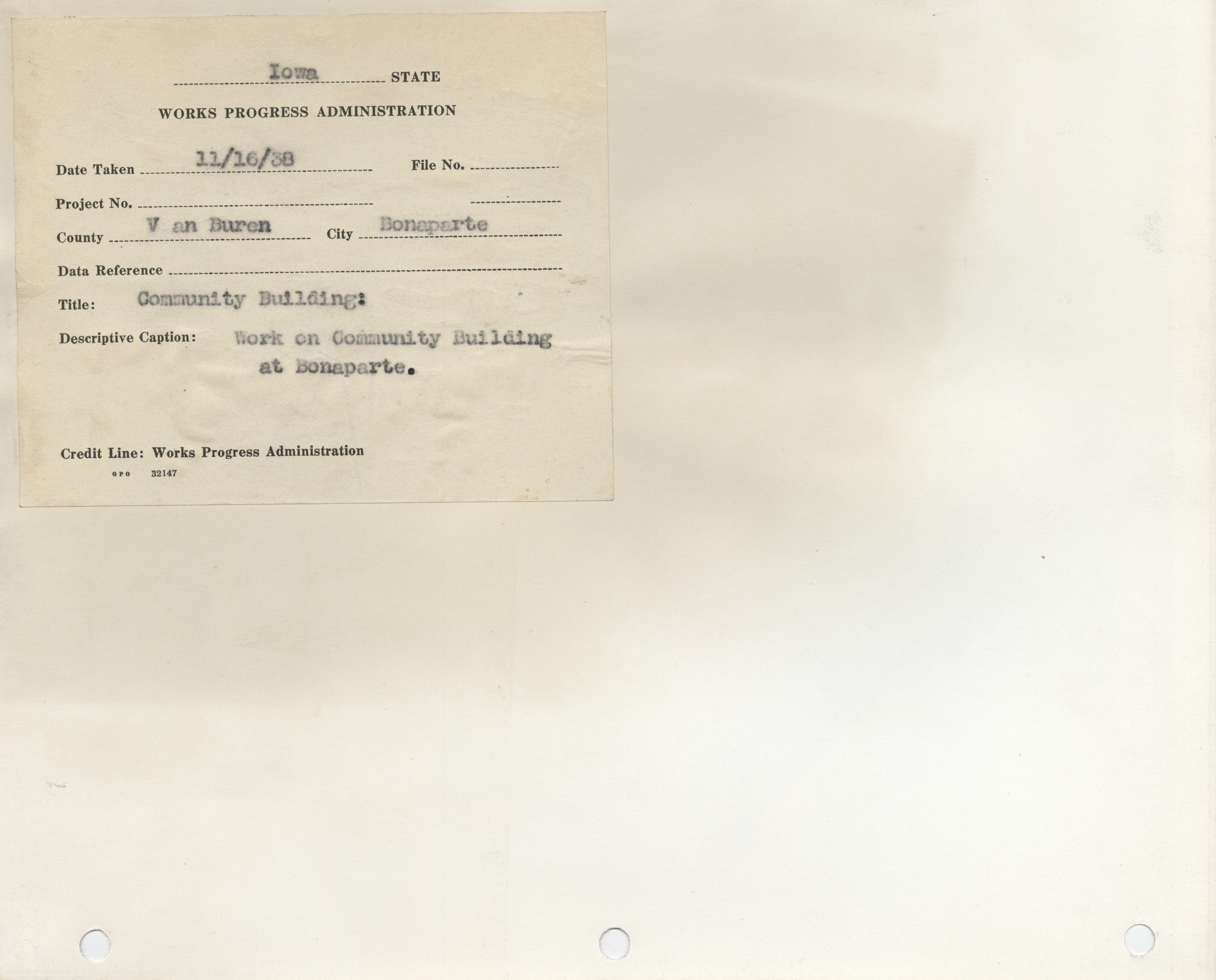 - Community Buildings. Van Buren County. Bonaparte. Work on Community Building. (1 b/w photograph), 1938