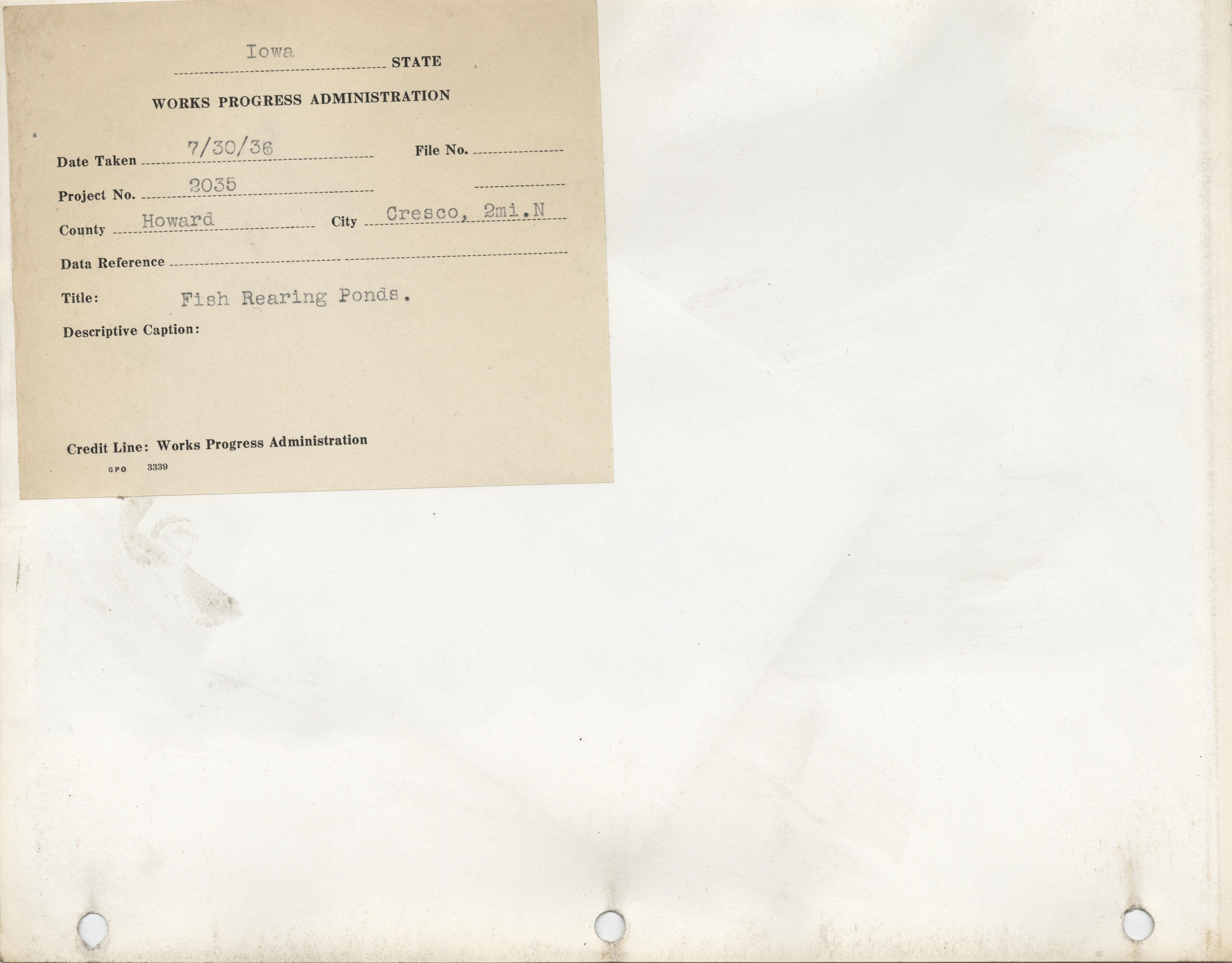 - Conservation. Howard County. Cresco. Fish Rearing Ponds. Project 2035. (2 b/w photographs), 1936-1937