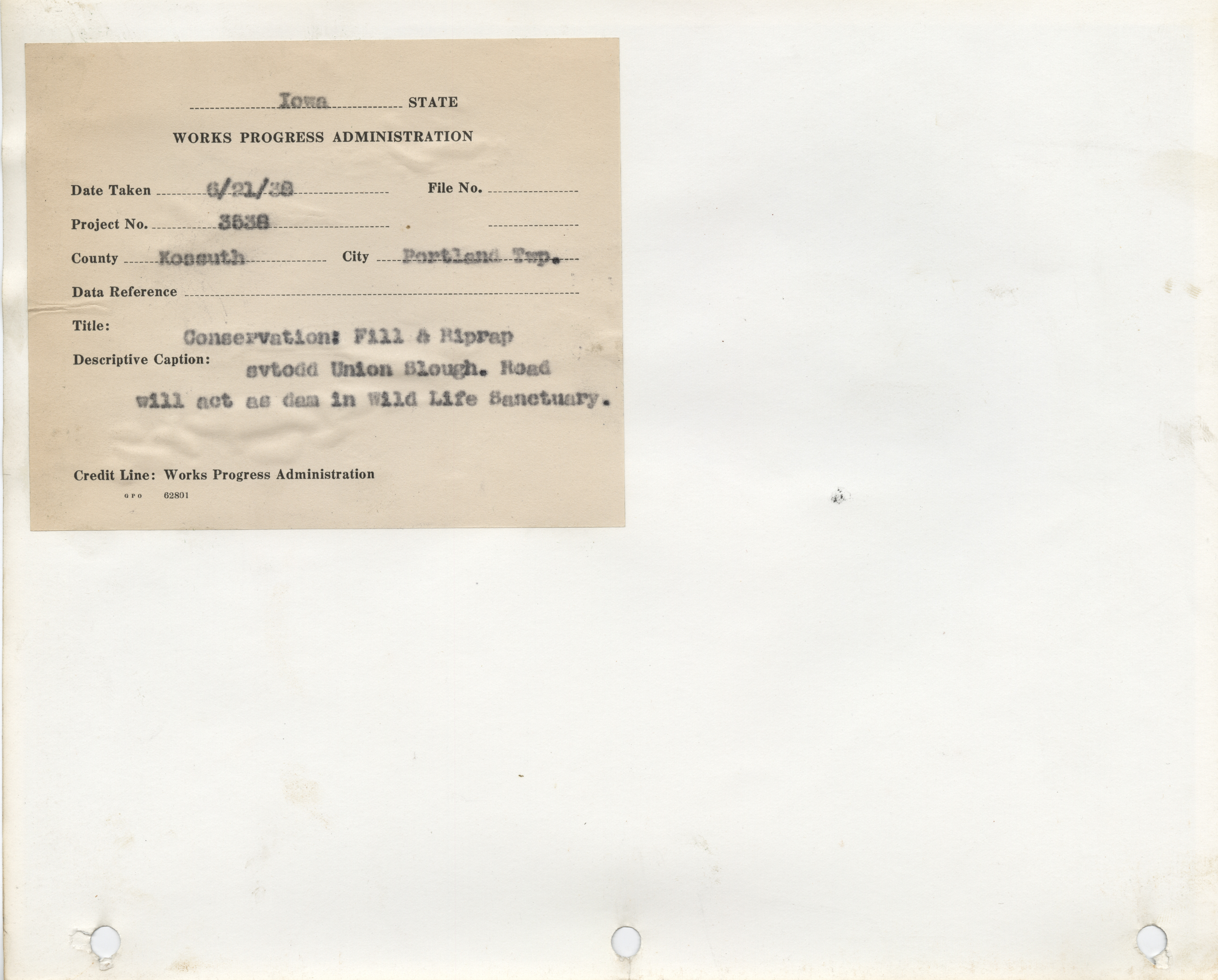 - Conservation. Kossuth County. Portland Township. Road Across Union Slough. Project 3538. (2 b/w photographs), 1938