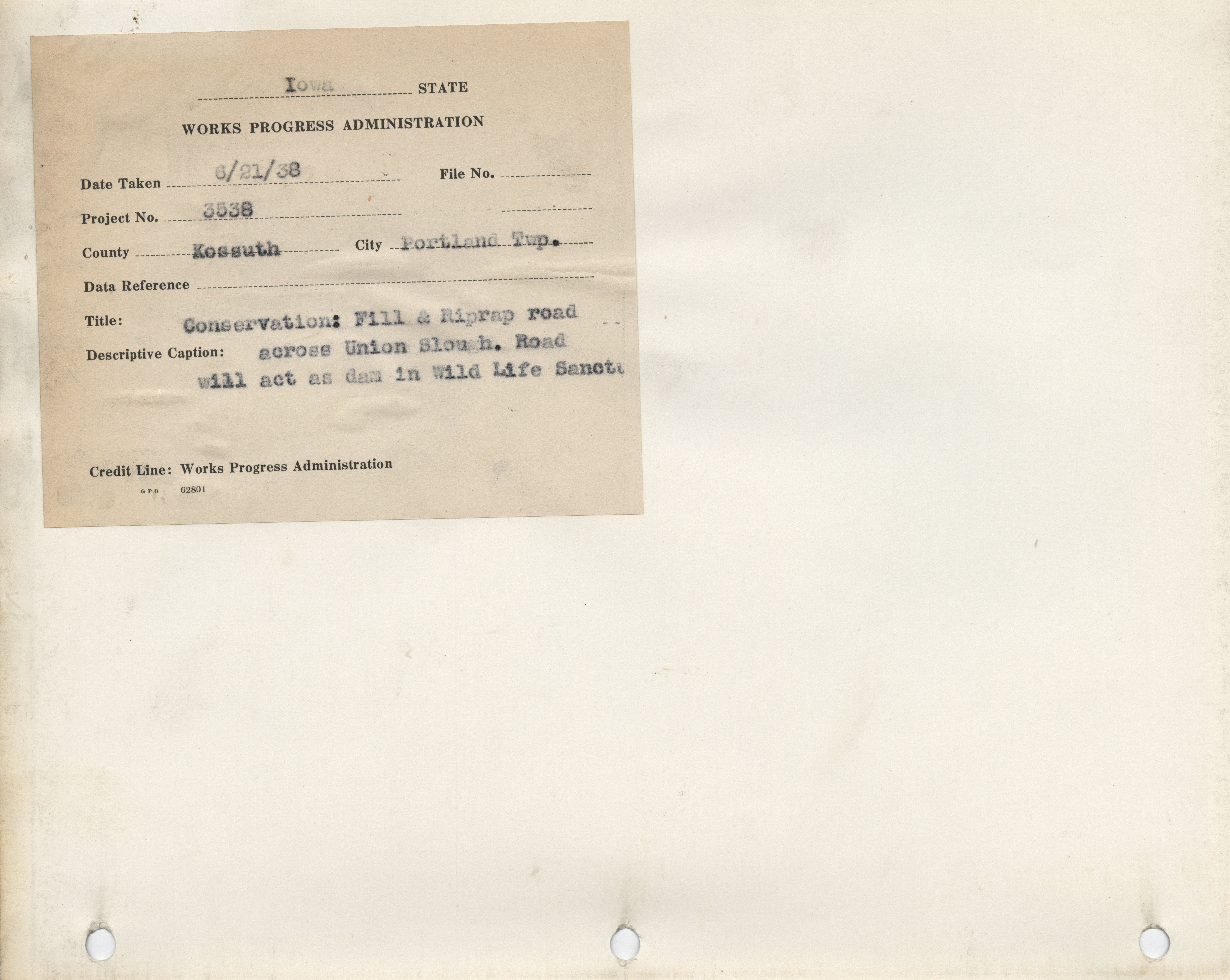 - Conservation. Kossuth County. Portland Township. Road Across Union Slough. Project 3538. (2 b/w photographs), 1938