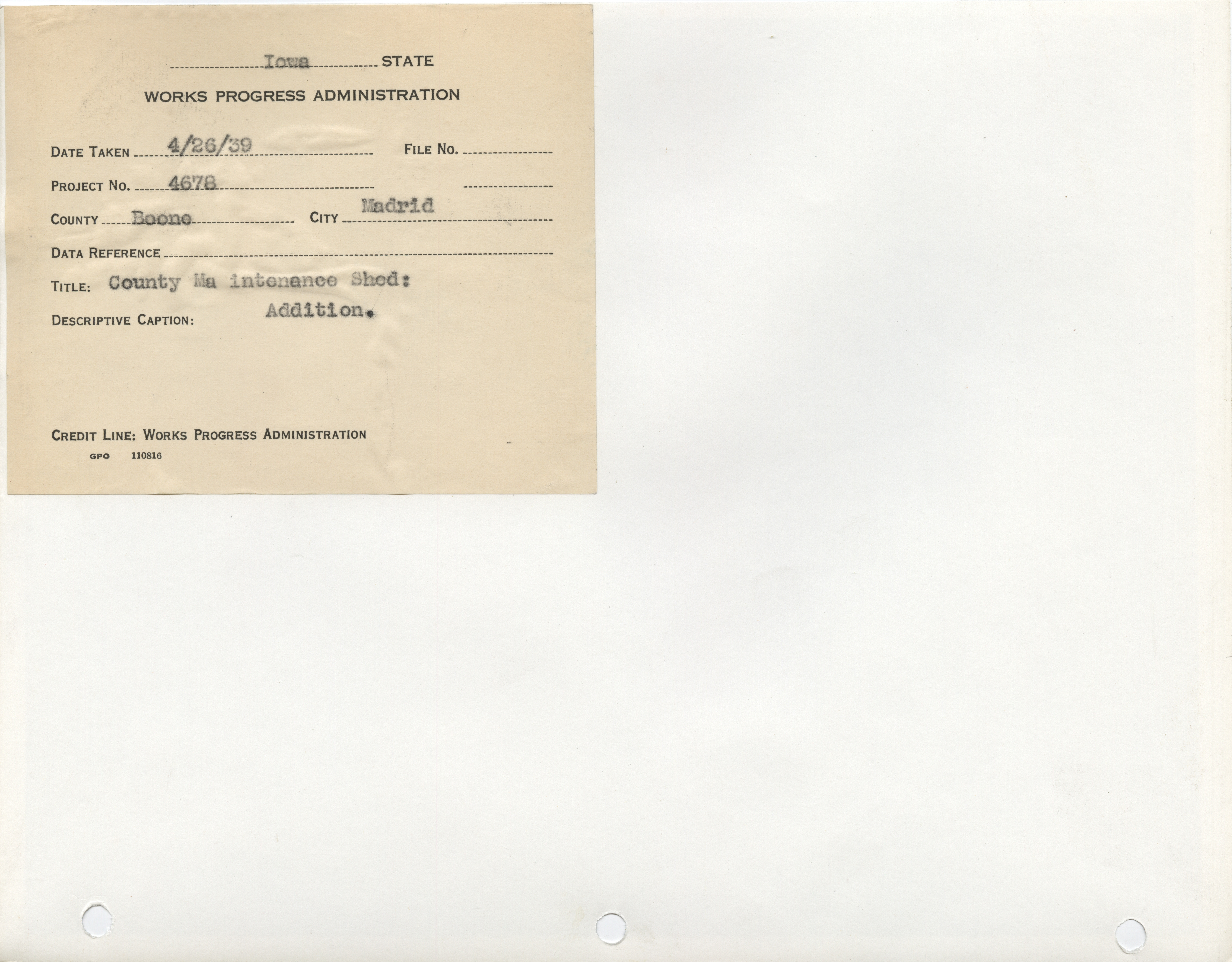 - "Photograph of the construction of a maintenance shed addition in Madrid", Work Projects Administration (Iowa) Photographs, Iowa State University Library Digital Collections