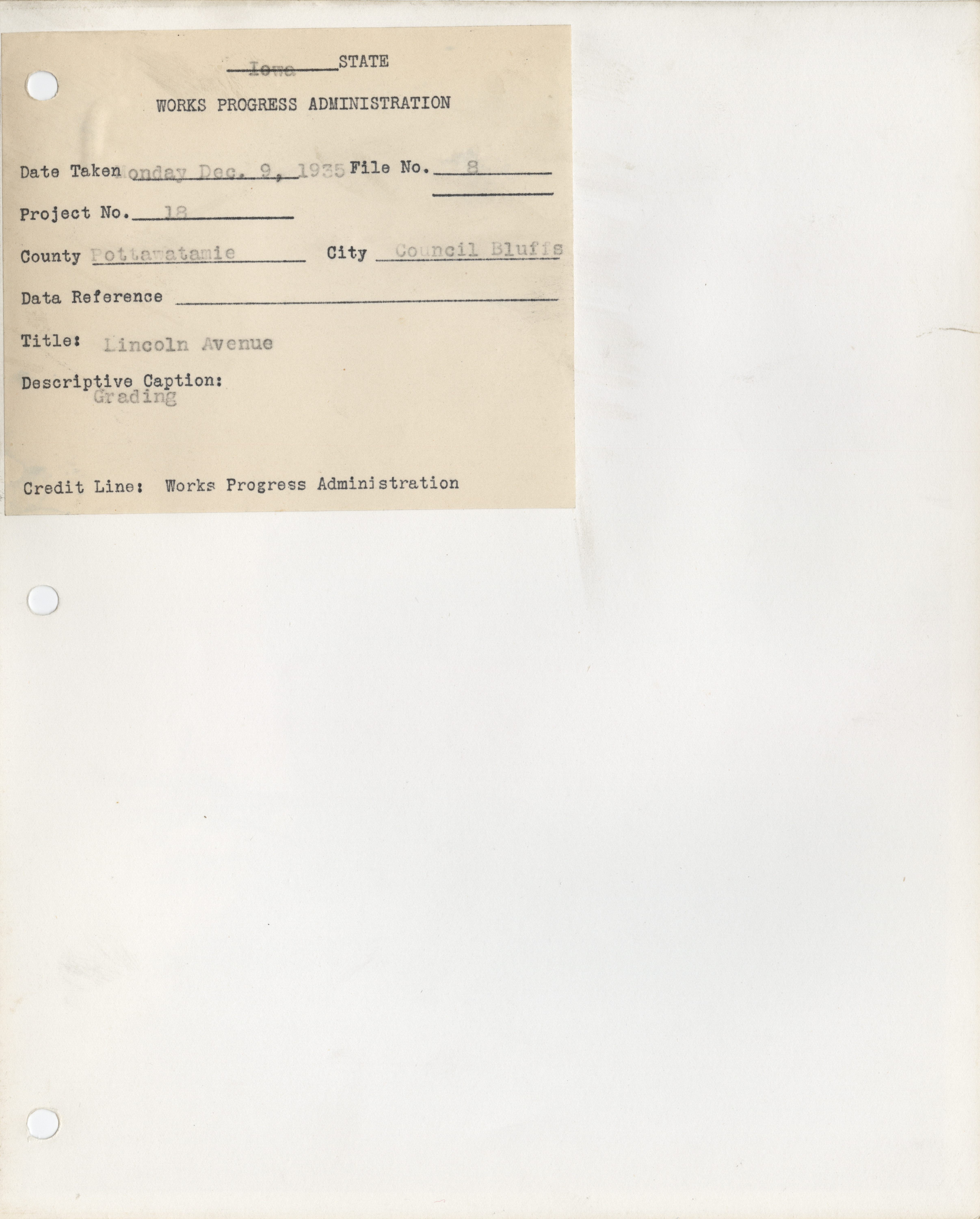 - "Photograph of people grading Lincoln Avenue in Council Bluffs", Work Projects Administration (Iowa) Photographs, Iowa State University Library Digital Collections