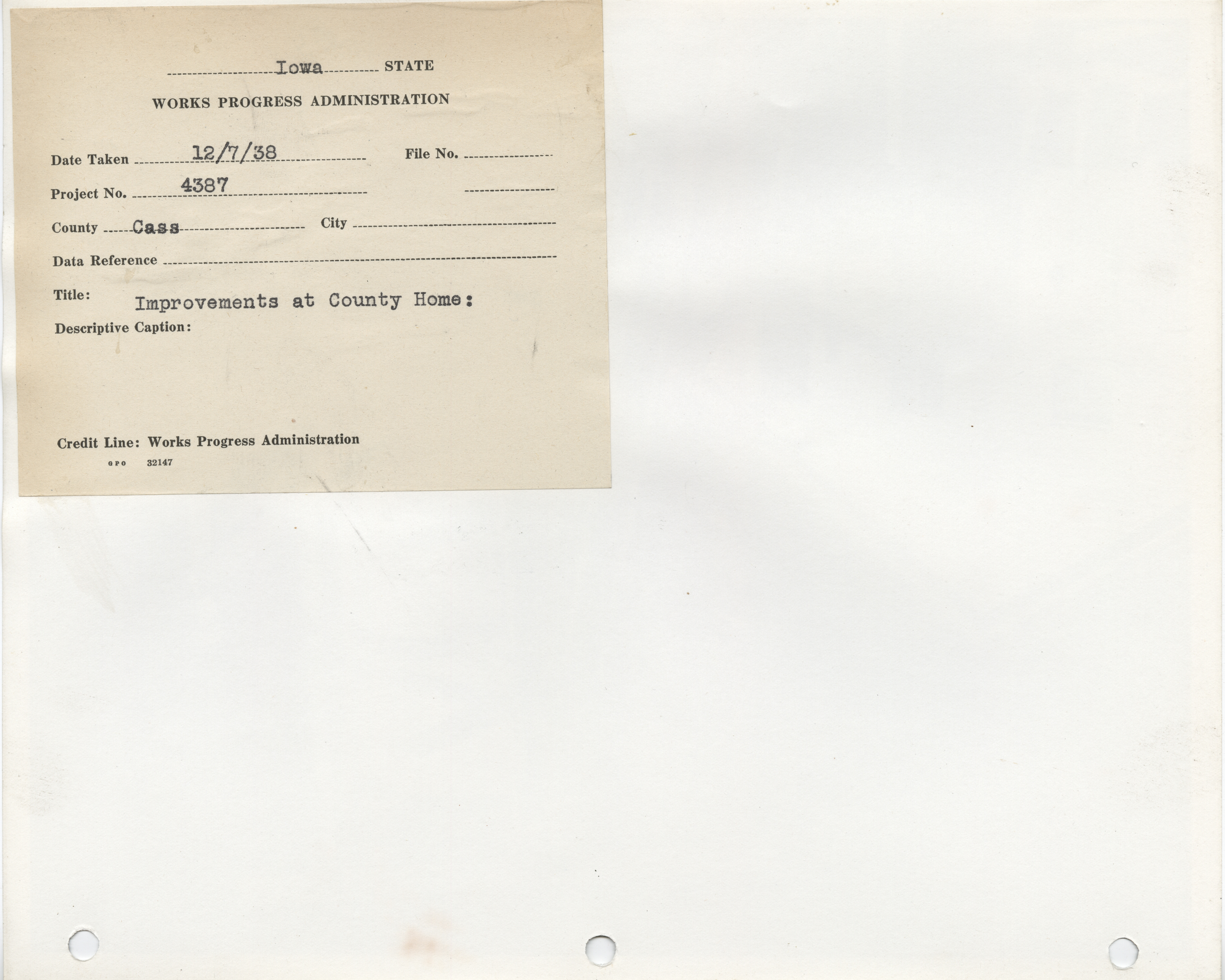 - "Photograph of the Cass County Home in Cass County", Work Projects Administration (Iowa) Photographs, Iowa State University Library Digital Collections