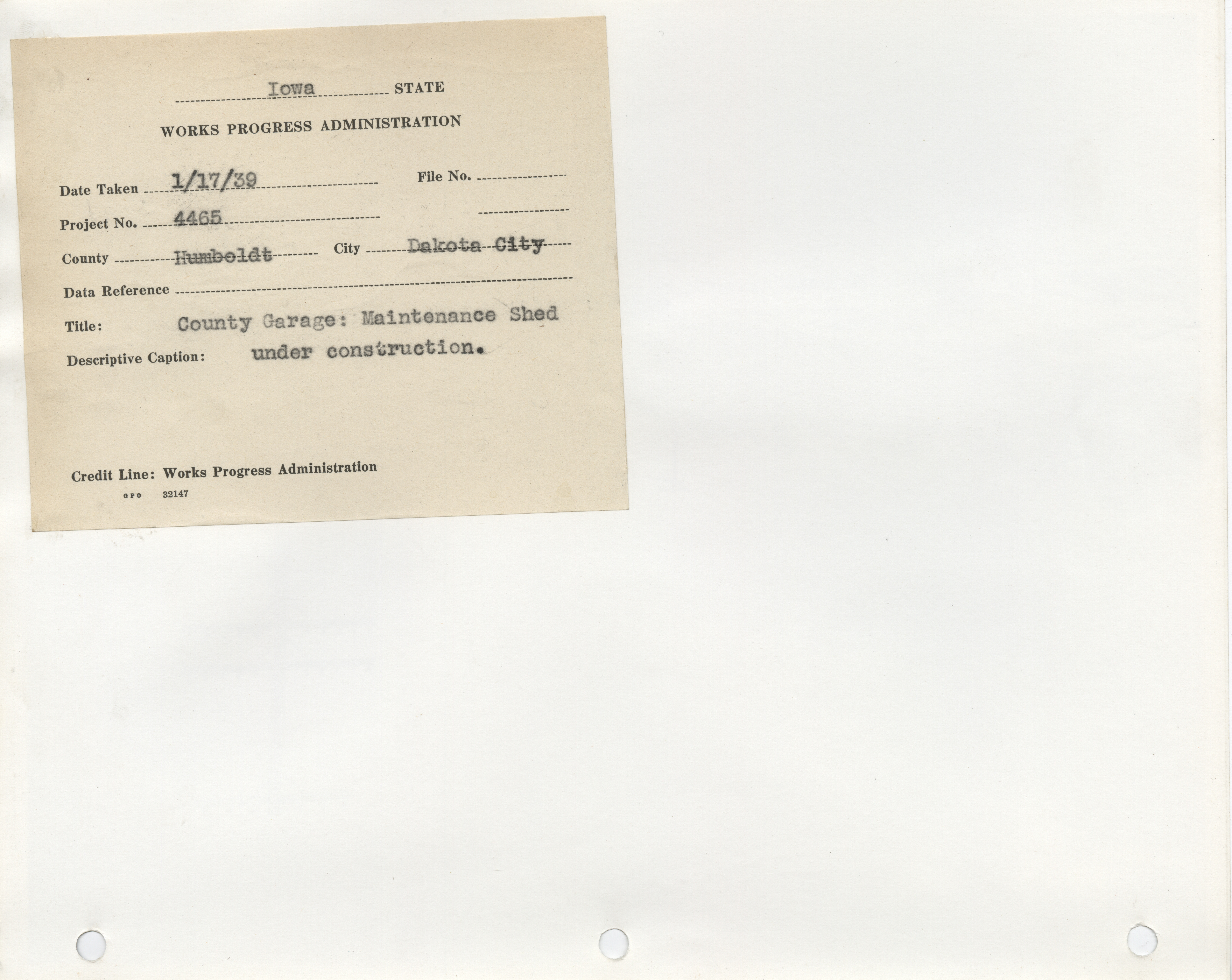 - "Photograph of the construction of a maintenance shed in Dakota City", Work Projects Administration (Iowa) Photographs, Iowa State University Library Digital Collections