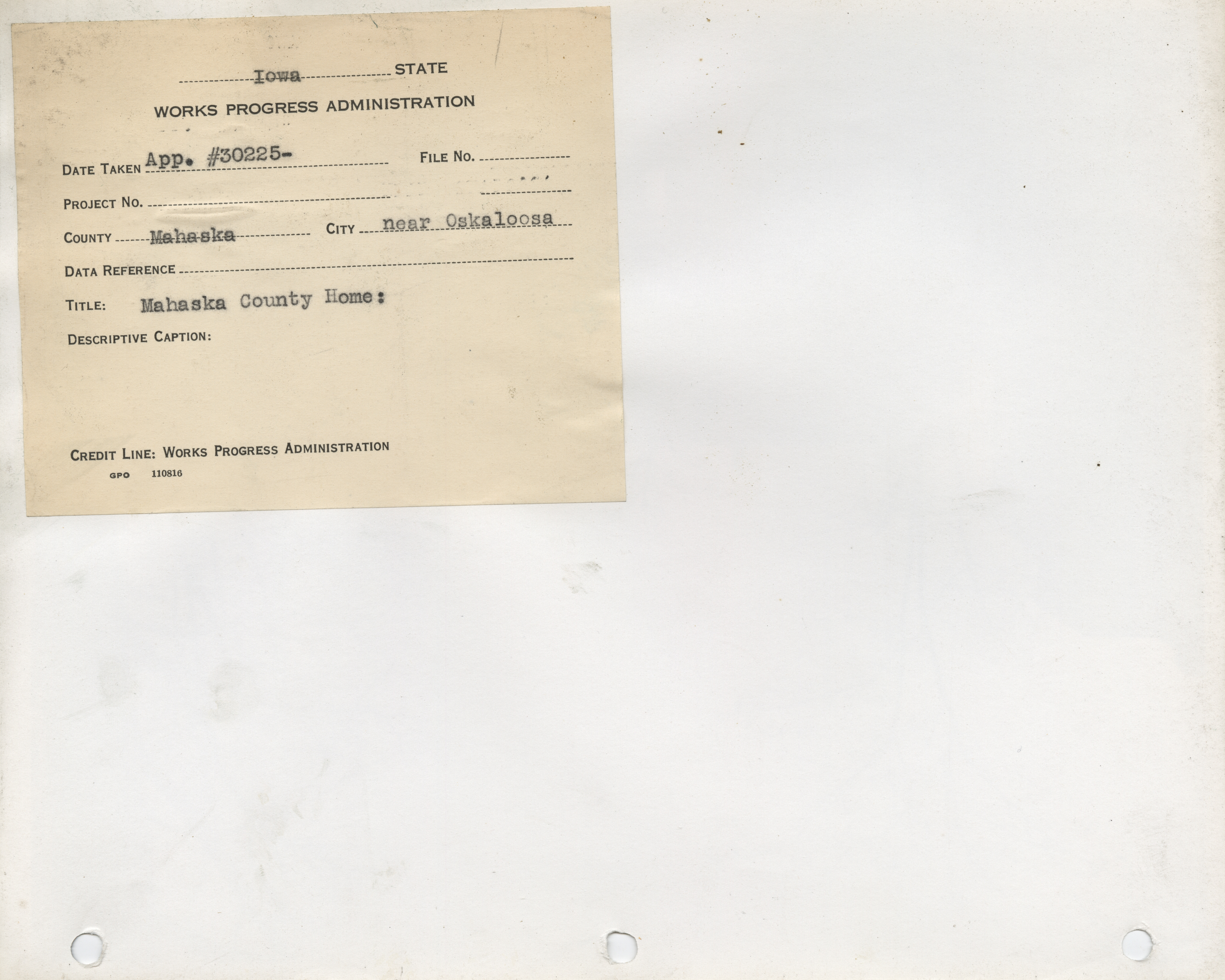 - "Photograph of the Mahaska County Home in Mahaska County", Work Projects Administration (Iowa) Photographs, Iowa State University Library Digital Collections