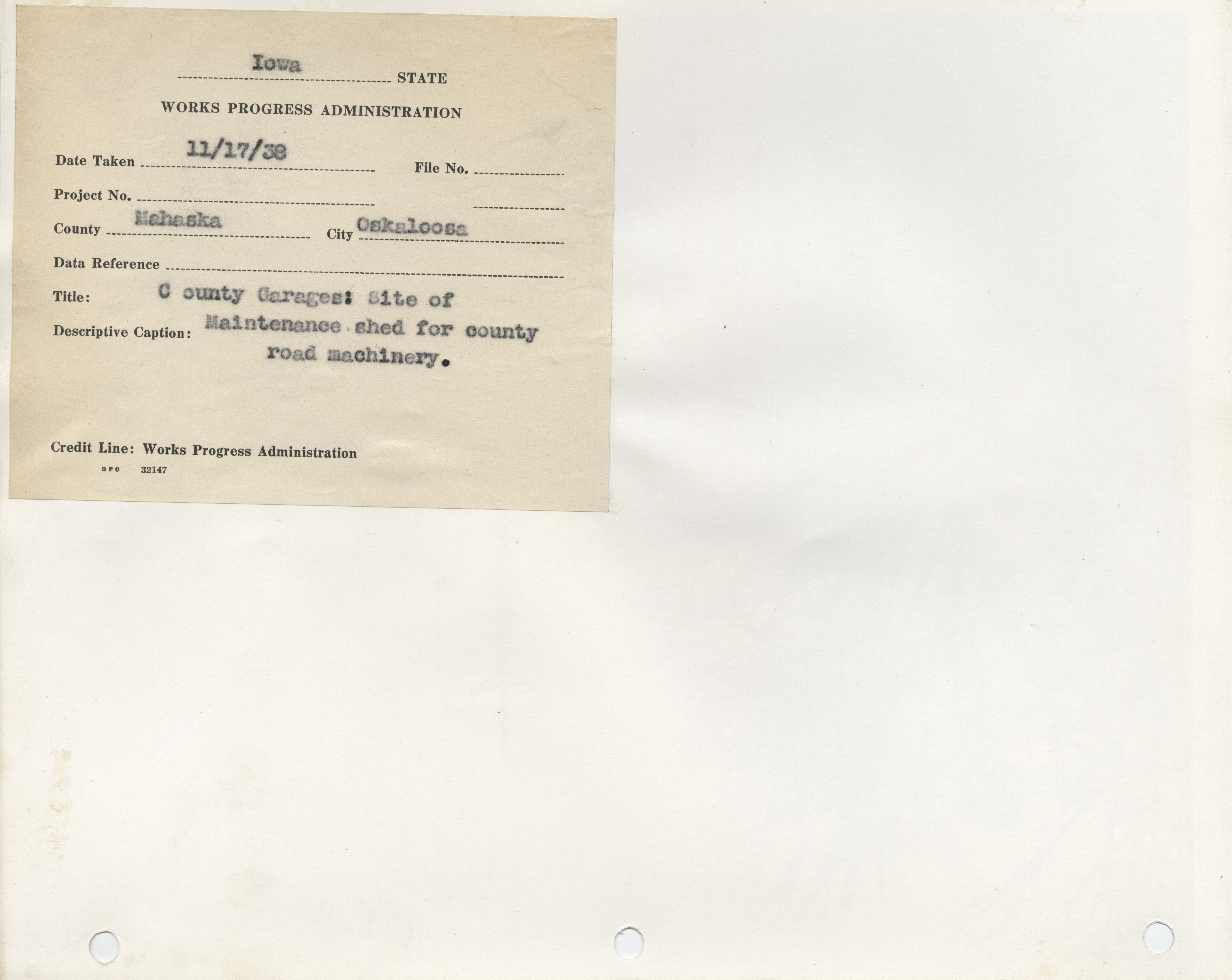 - "Photograph of the building site for a maintenance shed in Oskaloosa", Work Projects Administration (Iowa) Photographs, Iowa State University Library Digital Collections