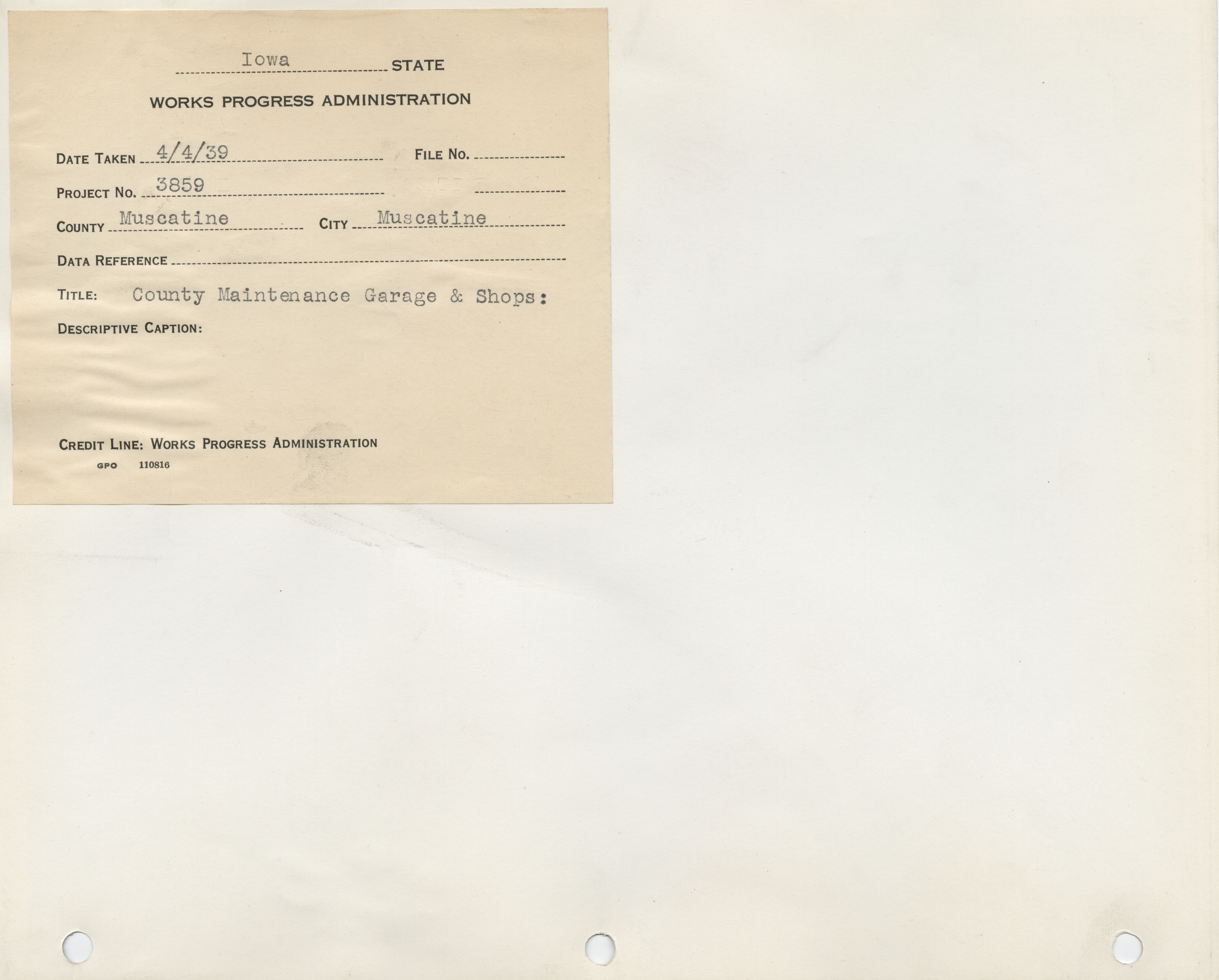 - County Buildings. Muscatine County. Muscatine. County Maintenance Garage and Shops. Project 3859. (1 b/w photograph), 1939