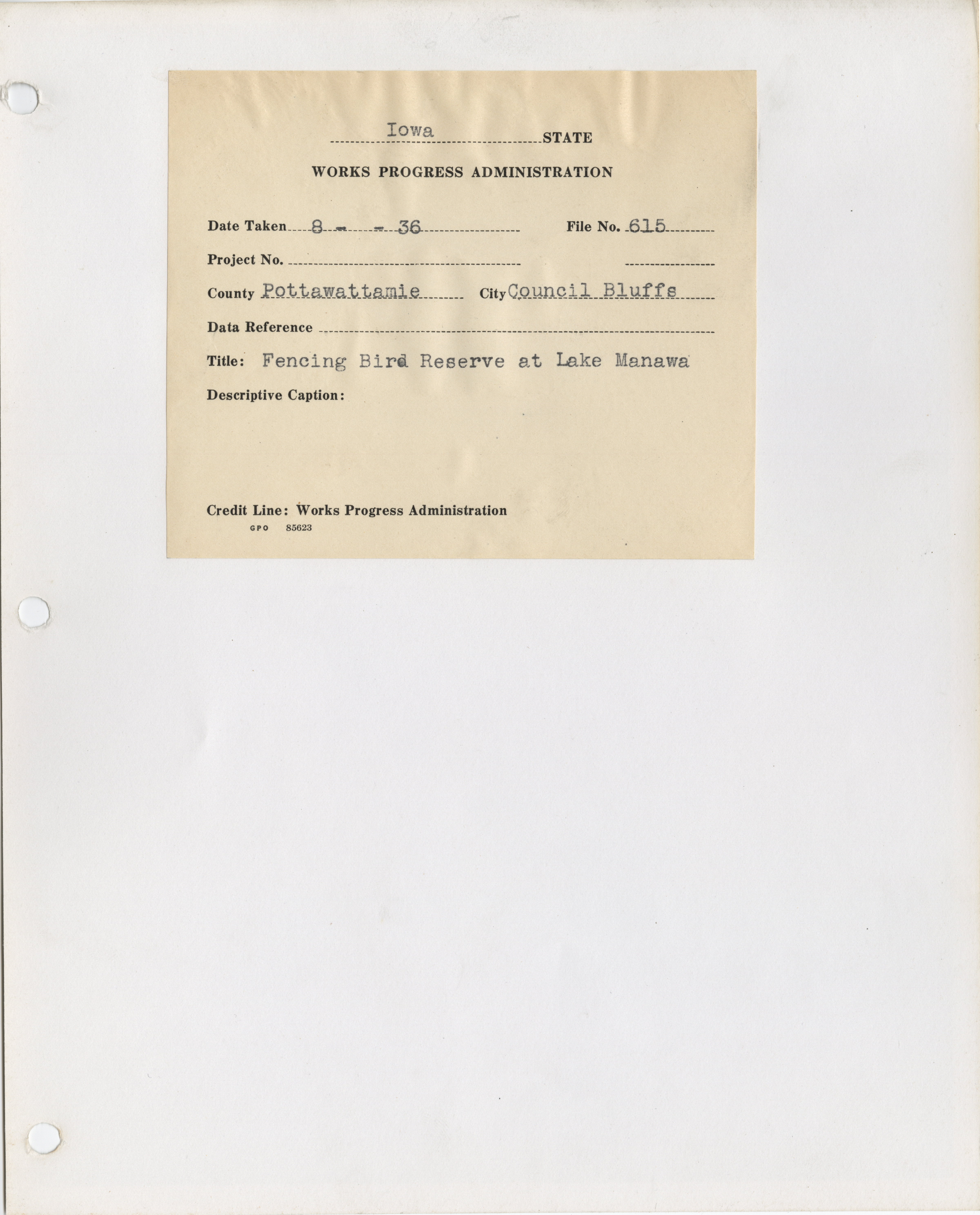- "Photograph of people fencing a bird reserve at Lake Manawa in Council Bluffs", Work Projects Administration (Iowa) Photographs, Iowa State University Library Digital Collections