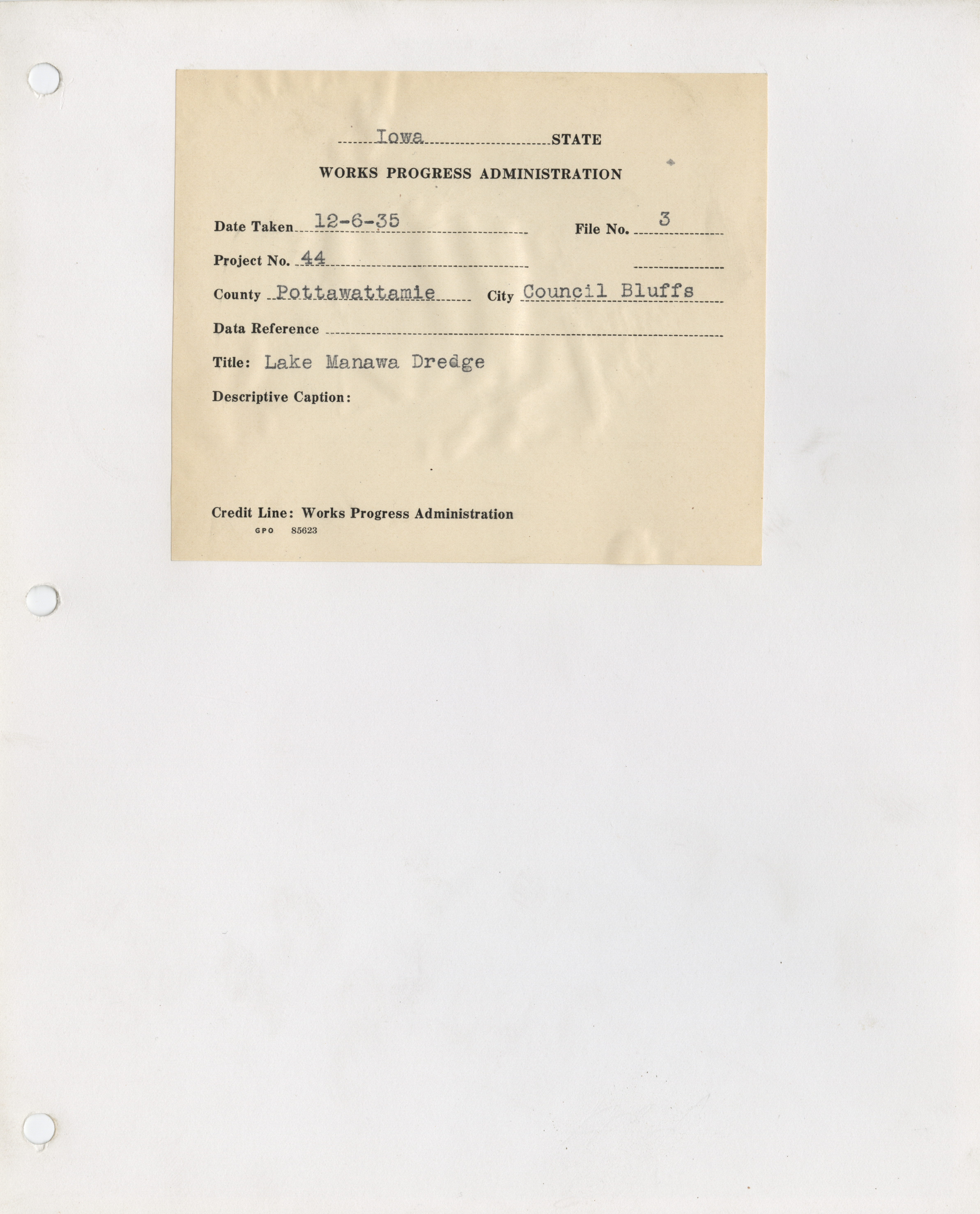 - "Photograph of dredging at Lake Manawa in Council Bluffs", Work Projects Administration (Iowa) Photographs, Iowa State University Library Digital Collections