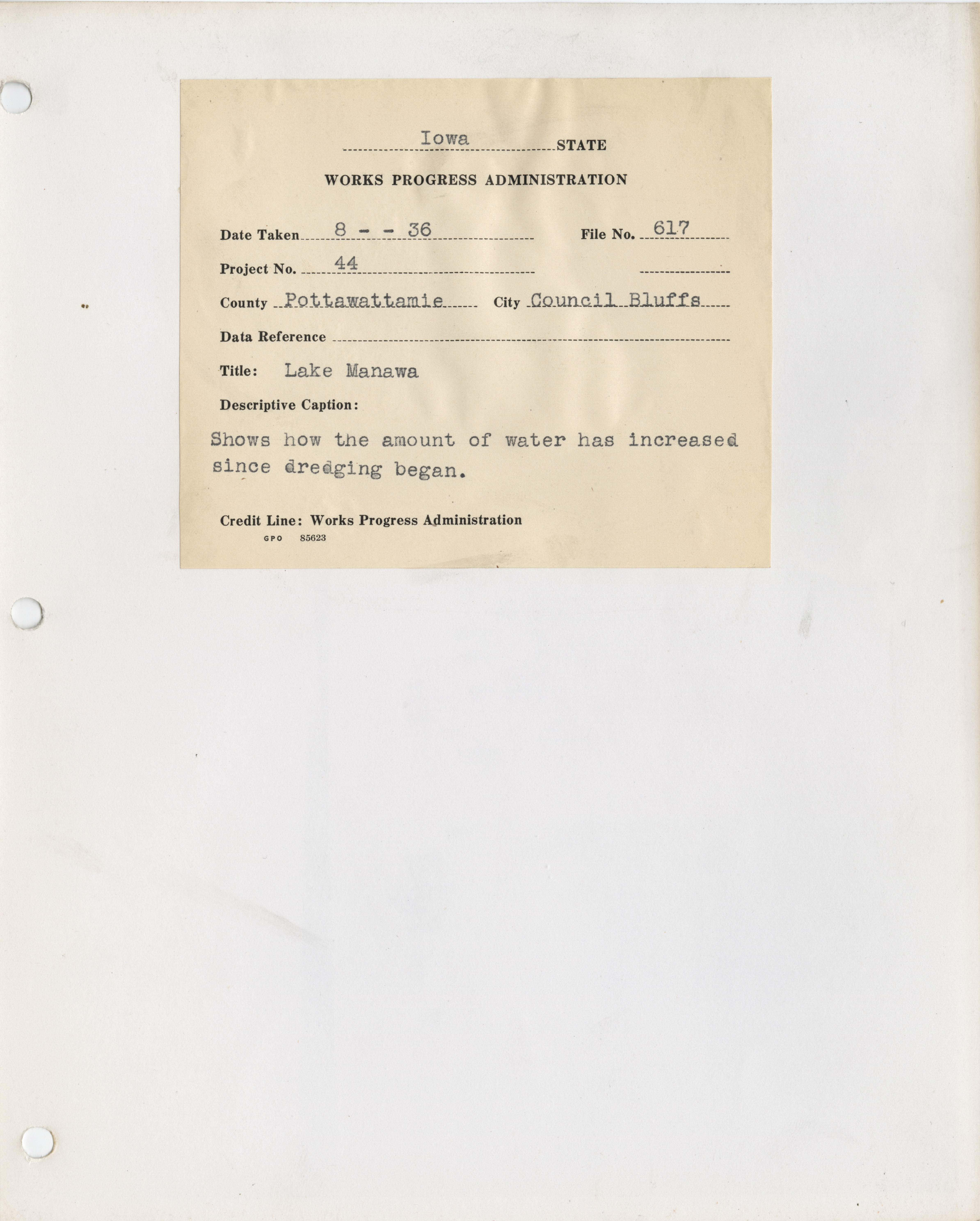 - District 5. Pottawattamie County. Council Bluffs. Lake Manawa Dredging and Improvements. Project 44. (6 b/w photographs), 1935-1936