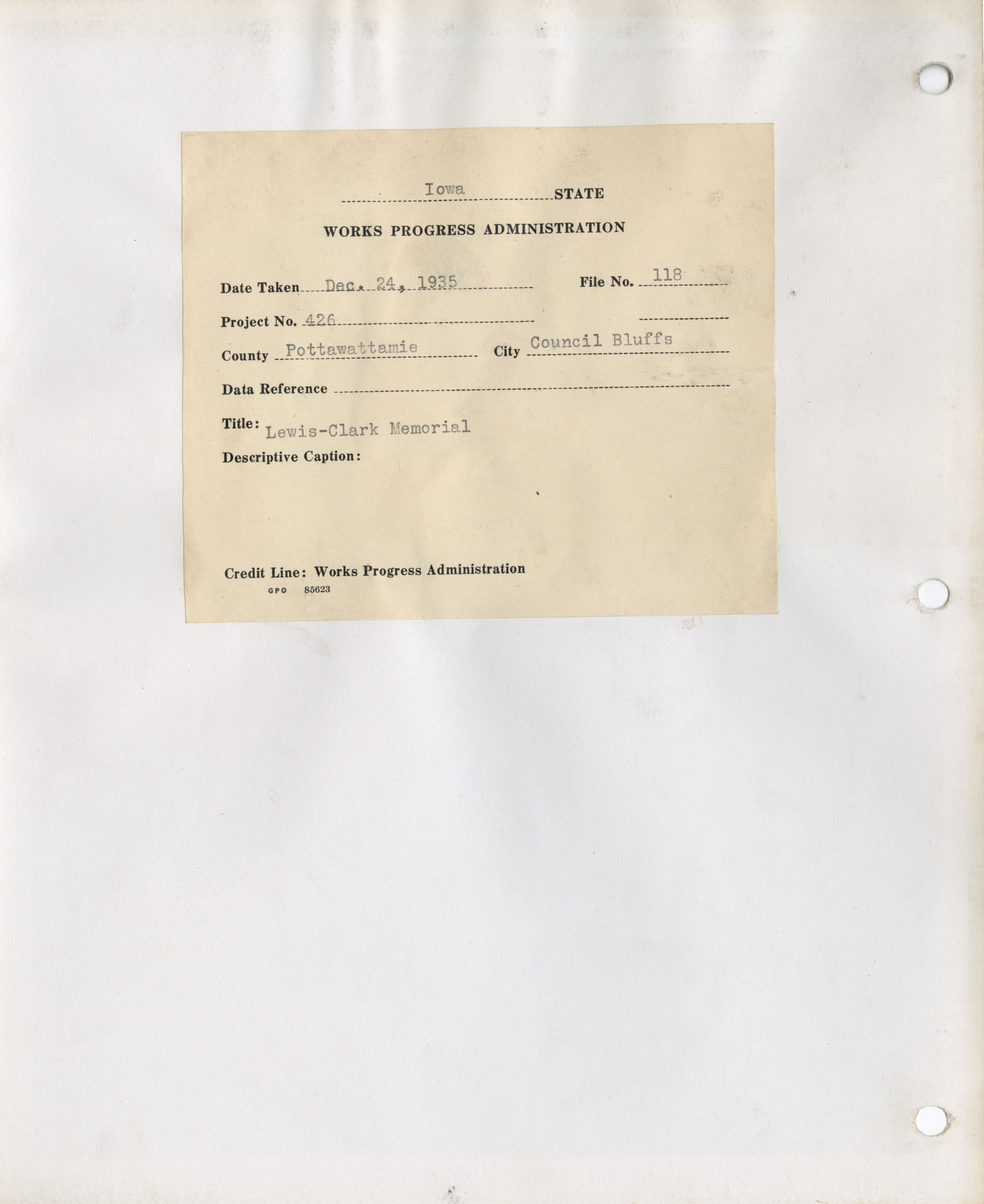 - District 5. Pottawattamie County. Council Bluffs. Lewis and Clark Monument. Project 426. (1 b/w photograph), 1935