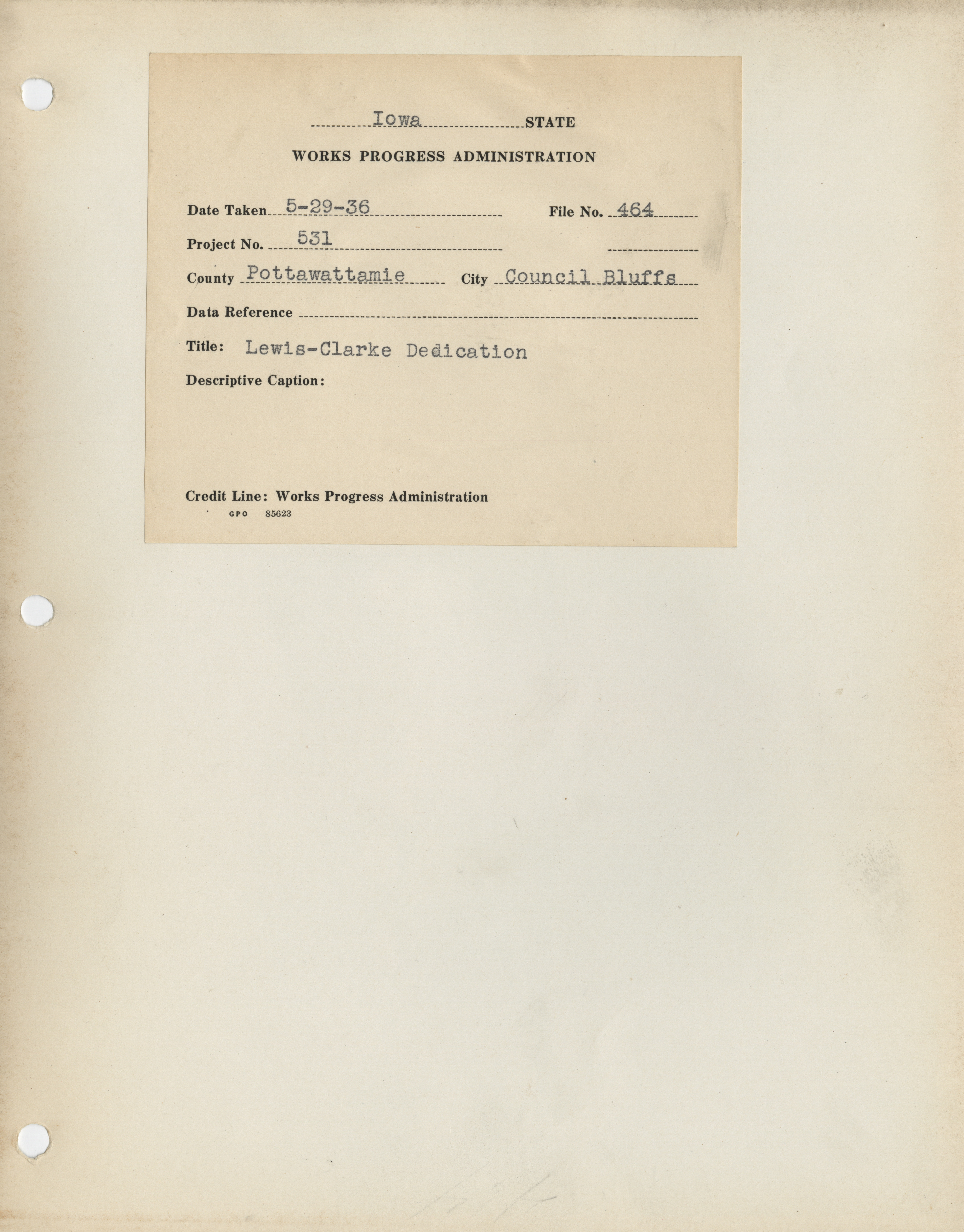 - "Photograph of the Lewis and Clark monument dedication in Council Bluffs", Work Projects Administration (Iowa) Photographs, Iowa State University Library Digital Collections