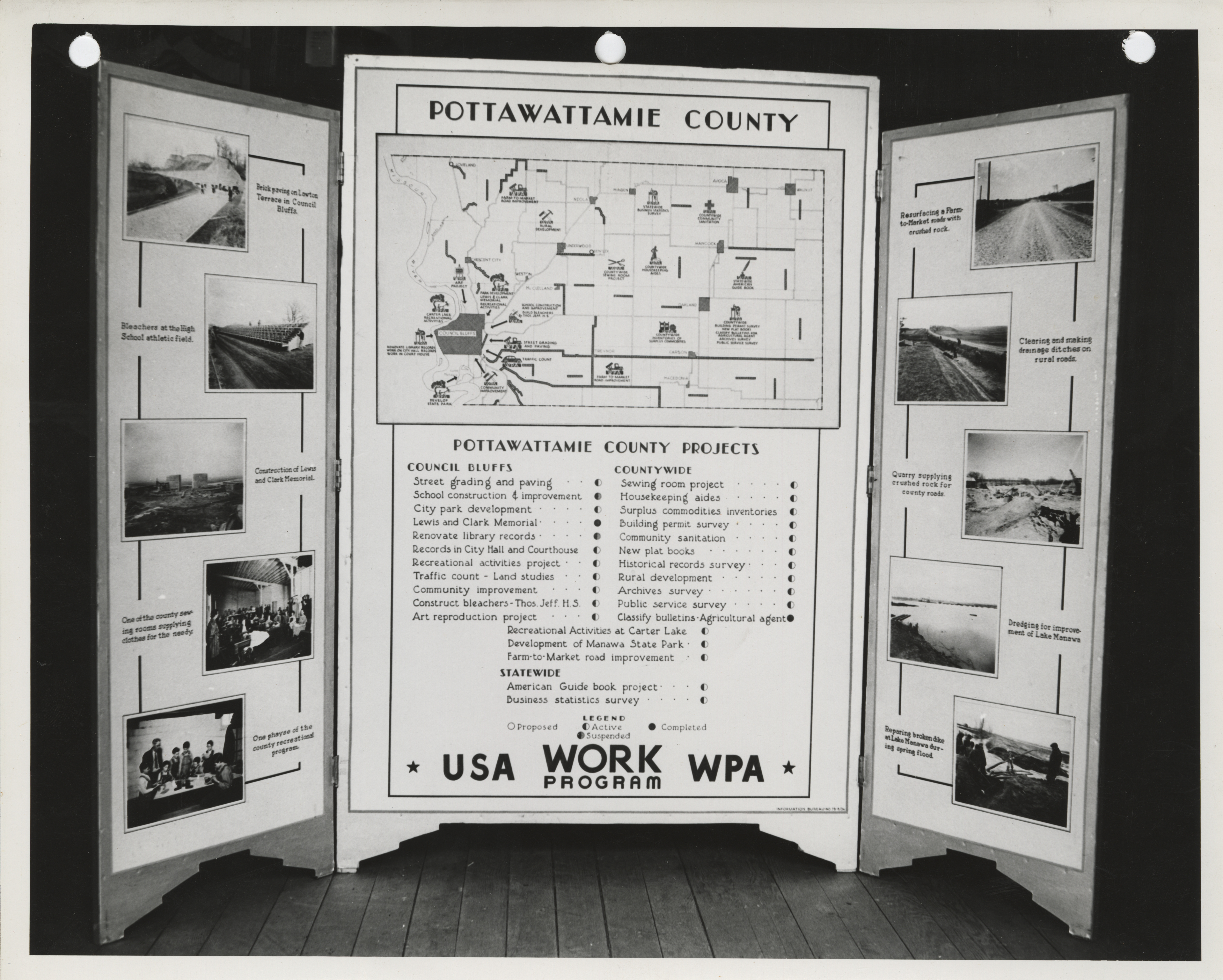 - "Photograph of the exhibit panel of WPA projects in Pottawattamie County", Work Projects Administration (Iowa) Photographs, Iowa State University Library Digital Collections