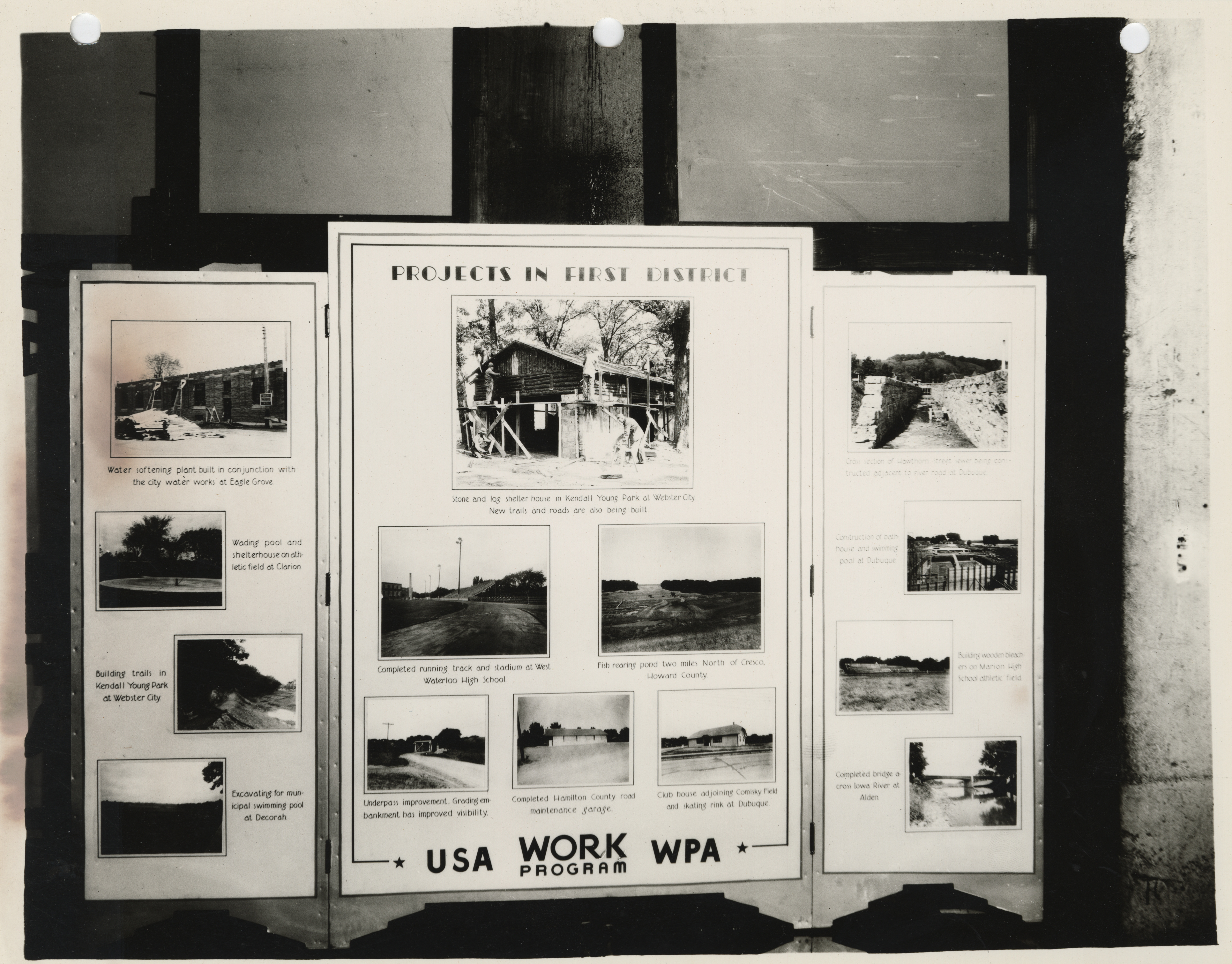 - "Photograph of the exhibit panel of Iowa WPA projects in the First District", Work Projects Administration (Iowa) Photographs, Iowa State University Library Digital Collections